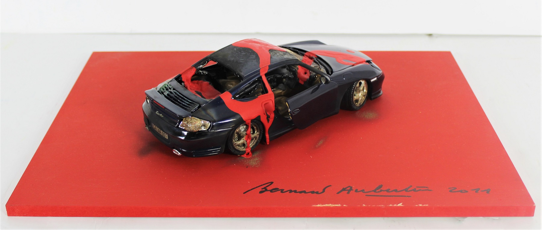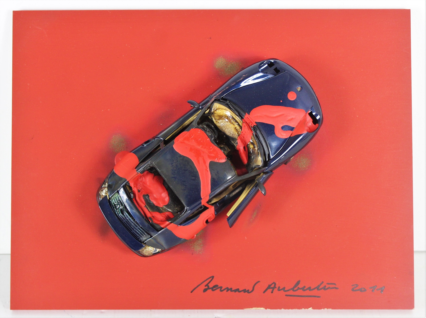 BERNARD AUBERTIN (1934-2015) – Voiture brulée - modellino - macchina bruciata su tavola rossa del 2011 cm 30x40 – Pubblicata – Archivio Rosemberg