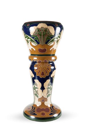 Grande vaso in ceramica a due elementi, scomponibile a terra, stelo e cache-pot a decoro