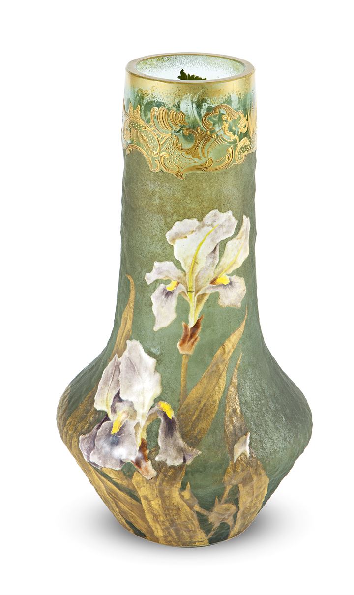 MONT JOIE Vaso troncoconico in vetro doppio, decoro di iris e foglie, dipinto...