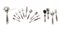 dodici coltelli, dodici forchette, dodici cucchiai da pasto; dodici forchettine, dodici coltelli, dodici cucchiai da dessert;dodici forchette da formaggio; un mestolo; due posate da insalata; un cucchiaio e un forchettone