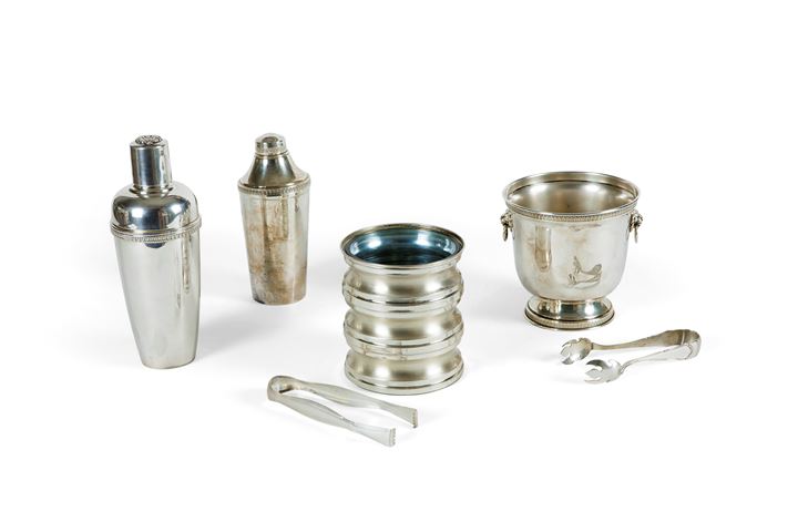 Lotto di sei oggetto in argento composto da due shaker, due portaghiaccio di cui uno con vetro e due pinze