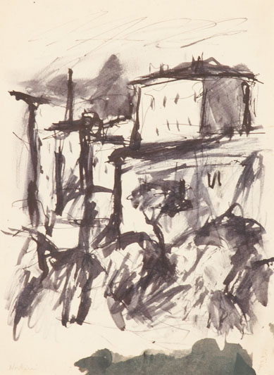 Gualtiero Nativi Paesaggio China acquerellata su carta, cm. 25x18,5 Firmato in basso a sinistra. Sul verso: altra opera firmata Autentica dell'Archivio Gualtiero Nativi su foto con timbro a secco, firma "Berto Nativi" e Archivio n° D4425.