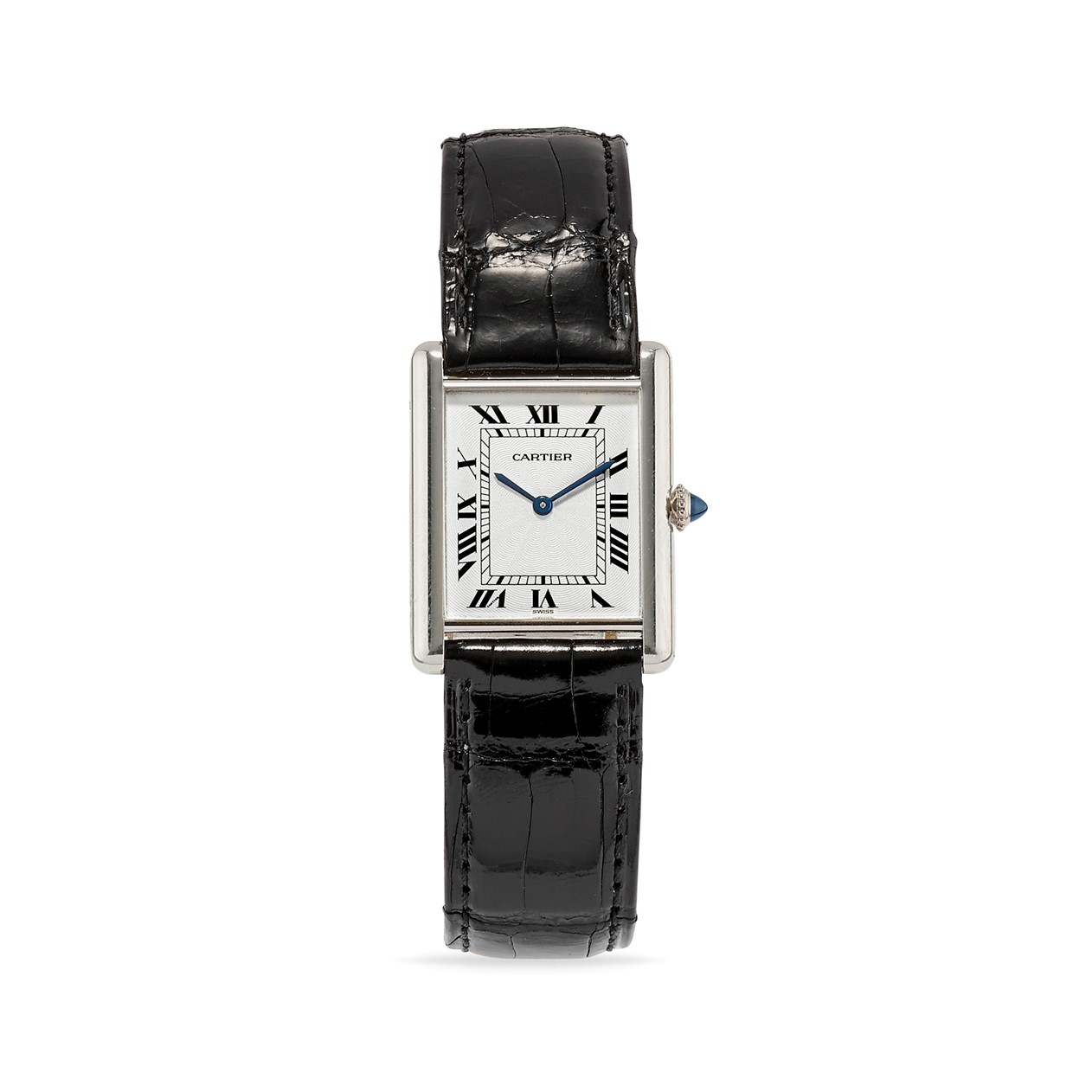 Cinturino in pelle Cartier e fibbia deployante in oro bianco 18k Cartier.