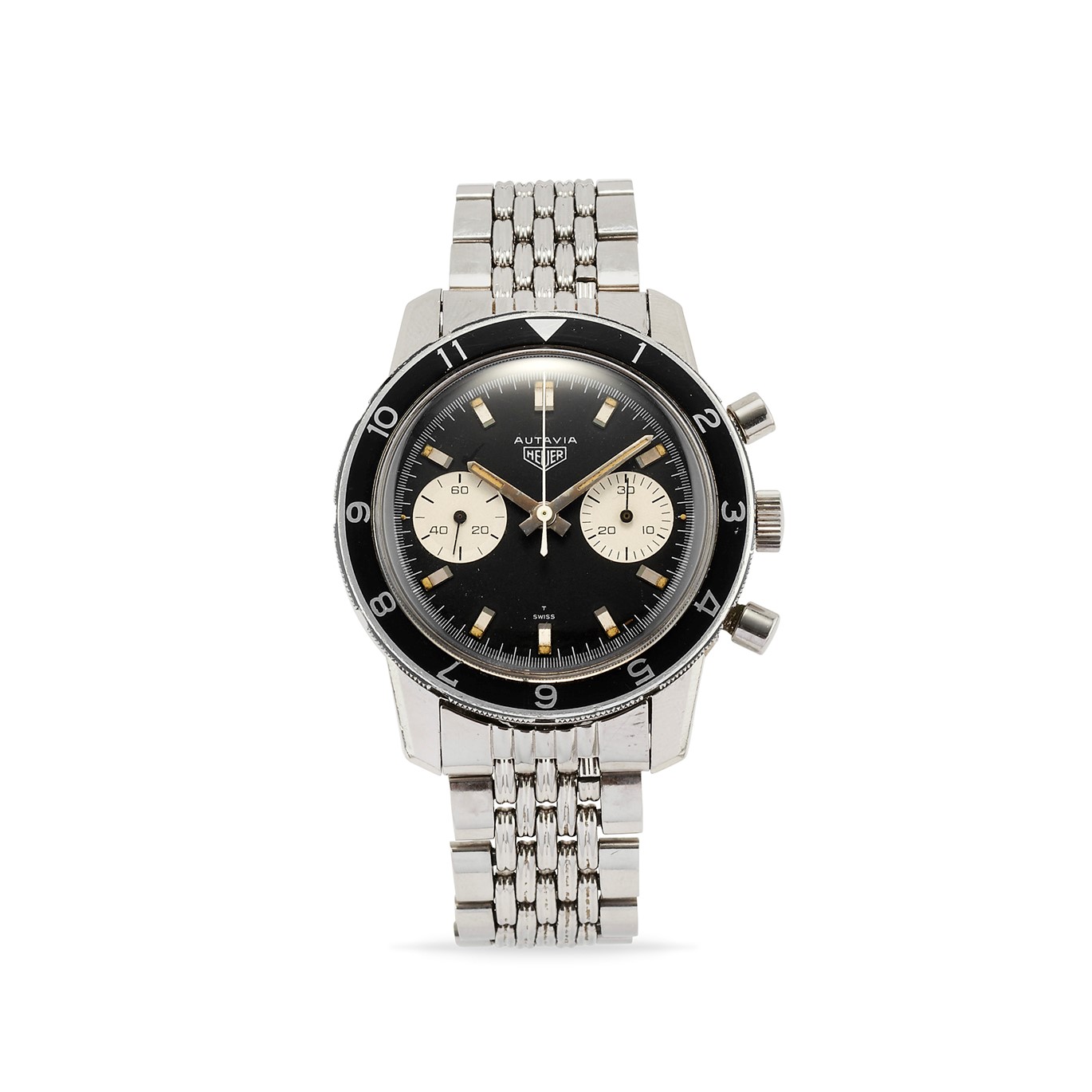 Quadrante nero, contatori bianchi, indici applicati.Movimento a carica manuale.Bracciale Heuer / Gay Frères in acciaio, deployante marcata 4.61.