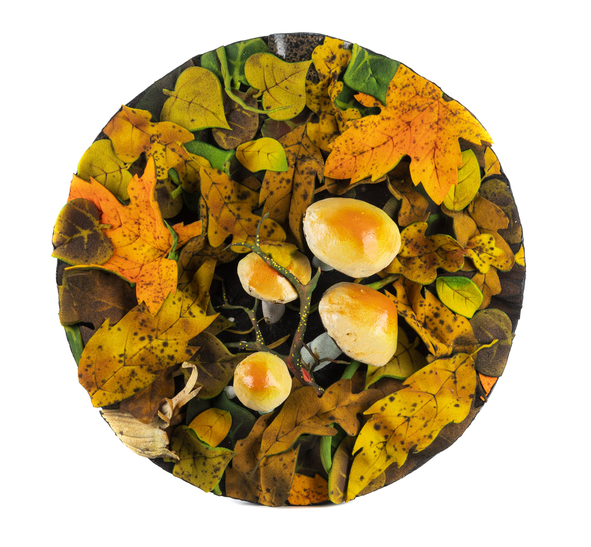 Scultura in gommapiuma dipinta in teca di plexiglas, diametro cm. 50, h. cm. 13