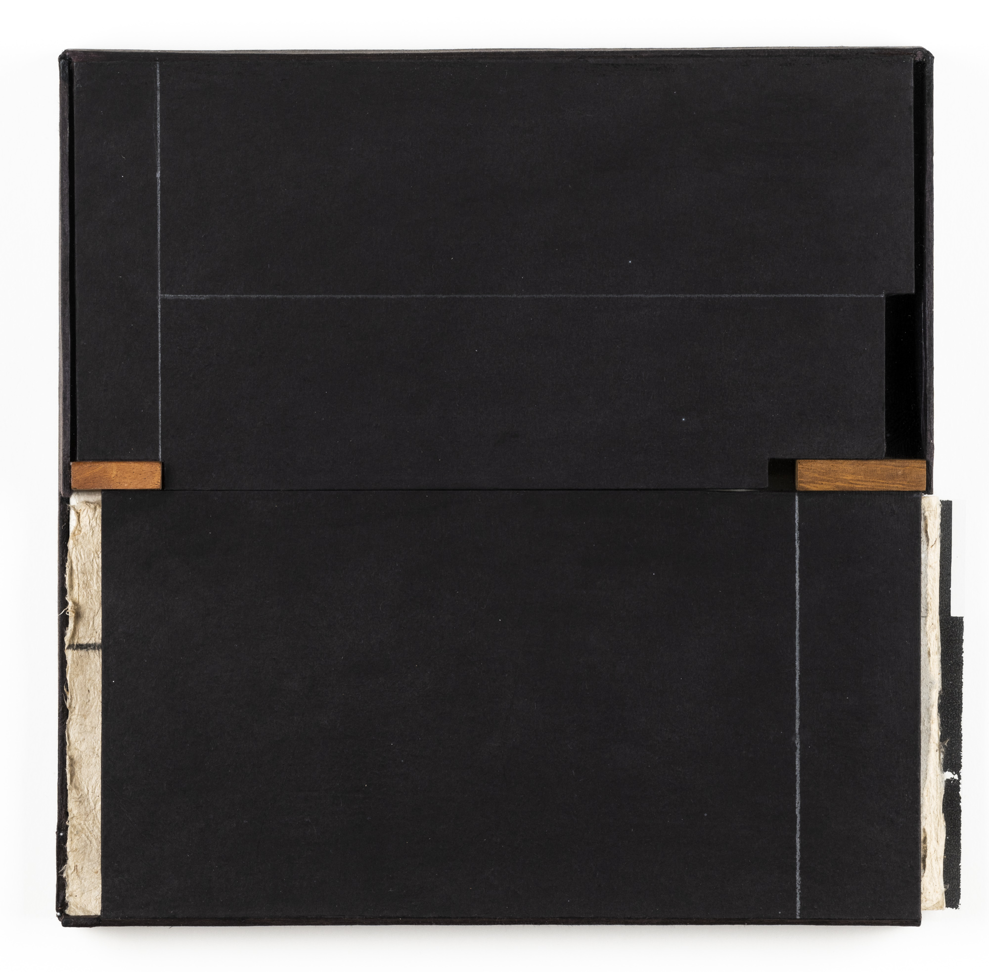 Assemblaggio e cartoni dipinti su tavola, cm. 30 x 30 x 3