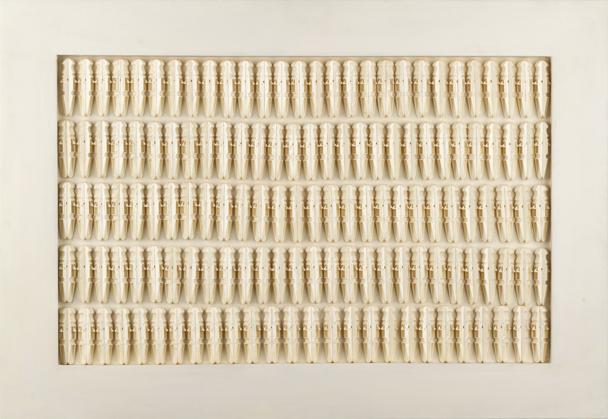 Assemblaggio di mollette di plastica su pannello, cm. 55 x 79