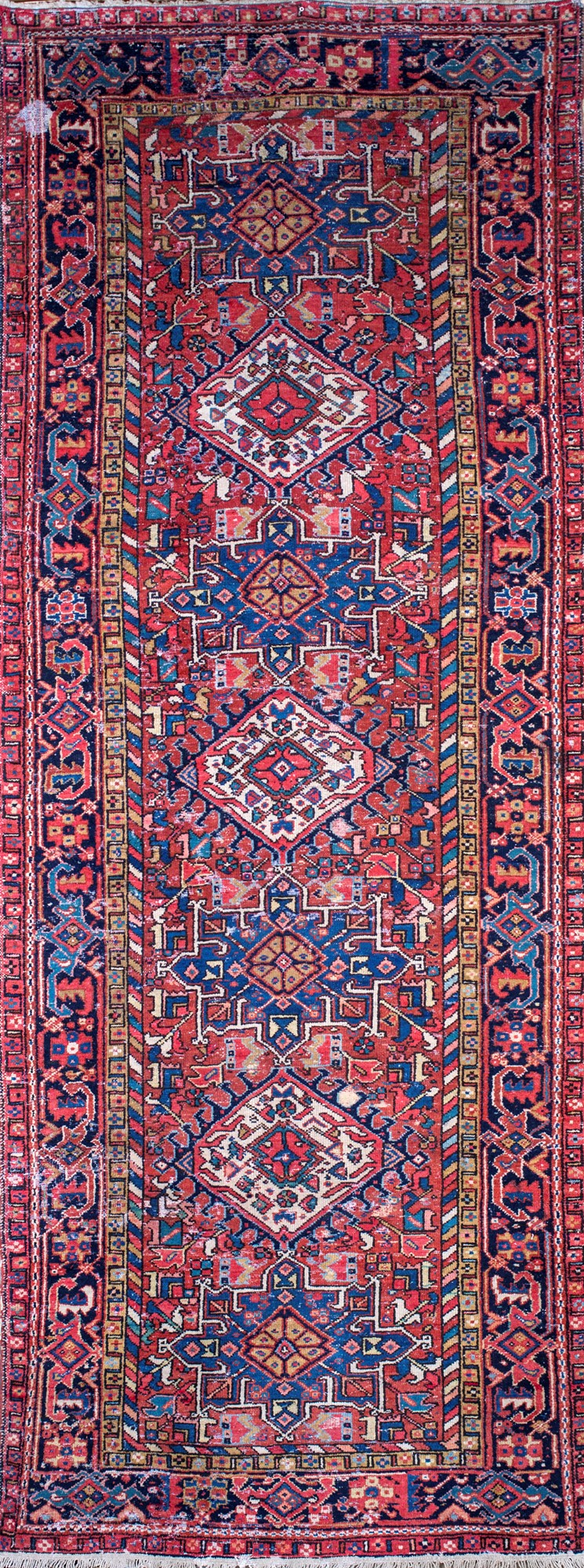 Corsia persiana Shiraz fondo rosso con sei medaglioni geometrici in bianco e azzurro alternati, 375x143