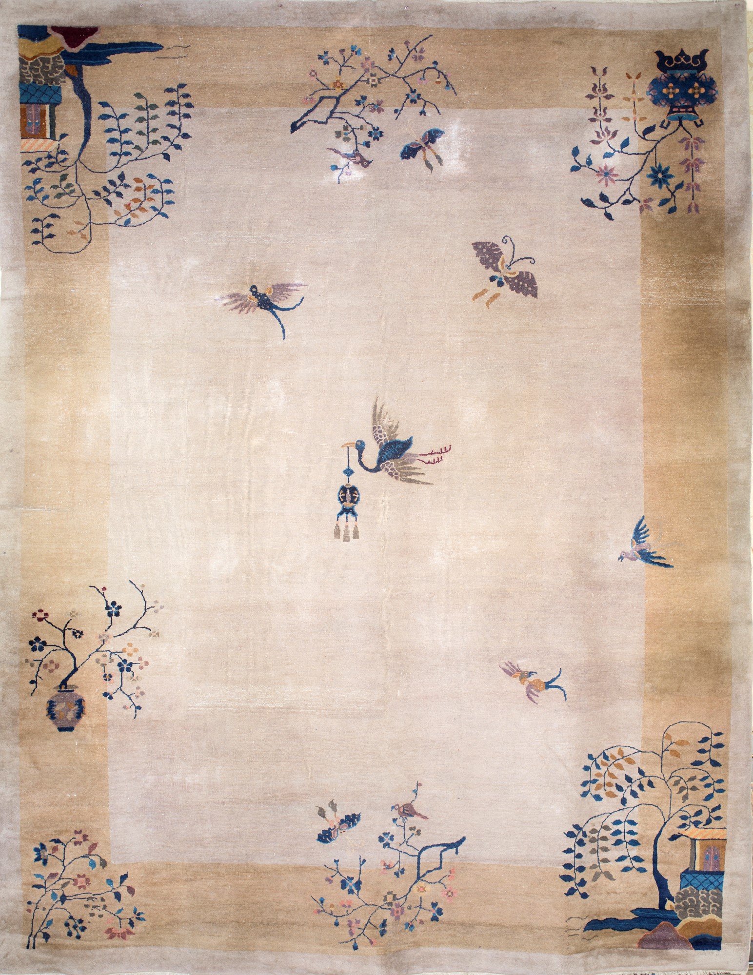Tappeto cinese Pechino fondo beige decorato da figura centrale di airone con lampada, da farfalle sparse e tralci fioriti, 350x275