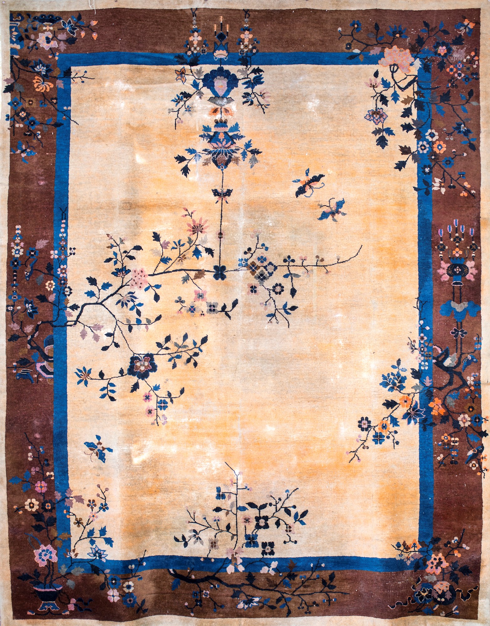 Tappeto cinese Pechino fondo beige con disegno asimmetrico sovrapposto sulla cornice blu delimitata da ampia bordura cacao, 340x275