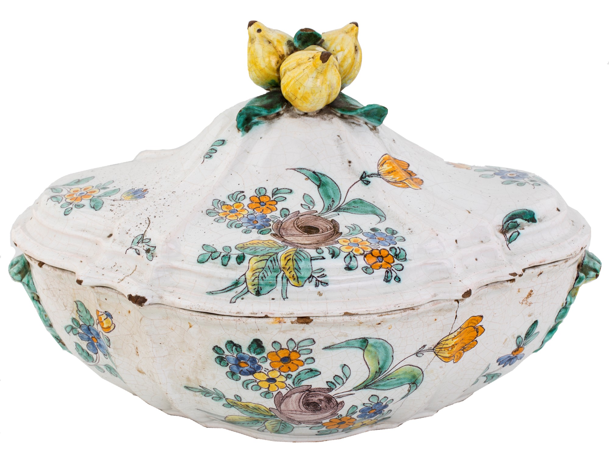 Zuppiera in maiolica, Cerreto Sannita, XVIII secolo decorata da composizioni floreali policrome; coperchio sormontato da frutti, 22x34x25