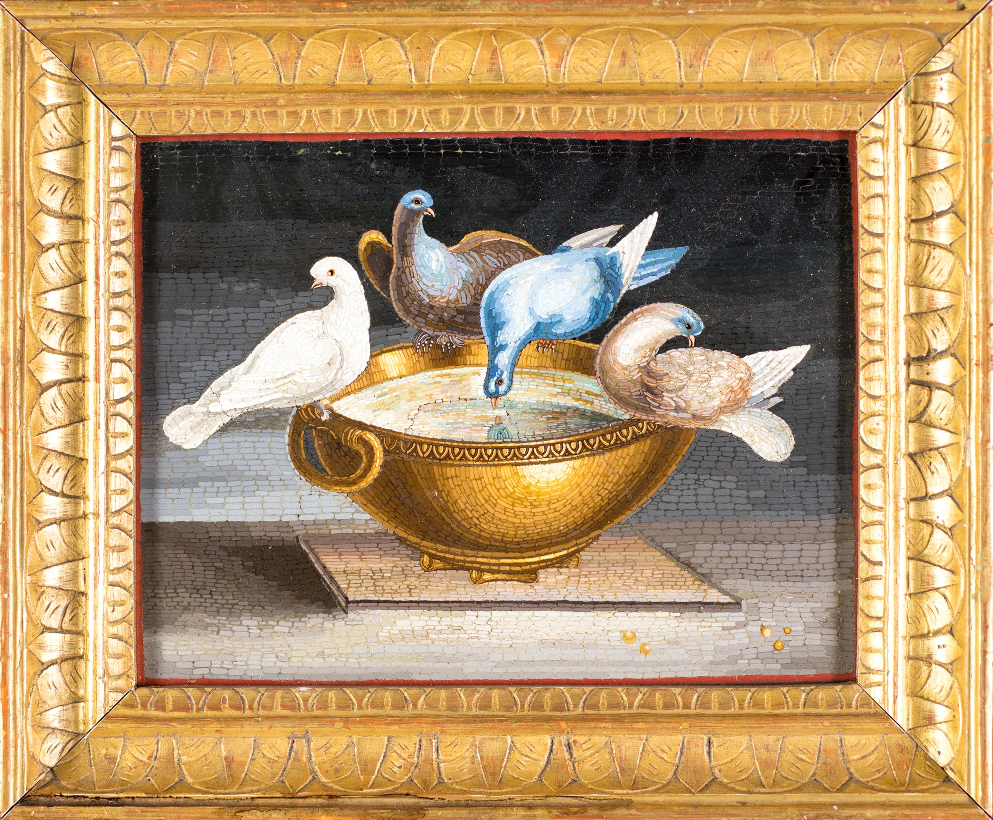 Mosaico minuto, Roma, XIX secolo raffigurante le colombe di Plinio; cornice...