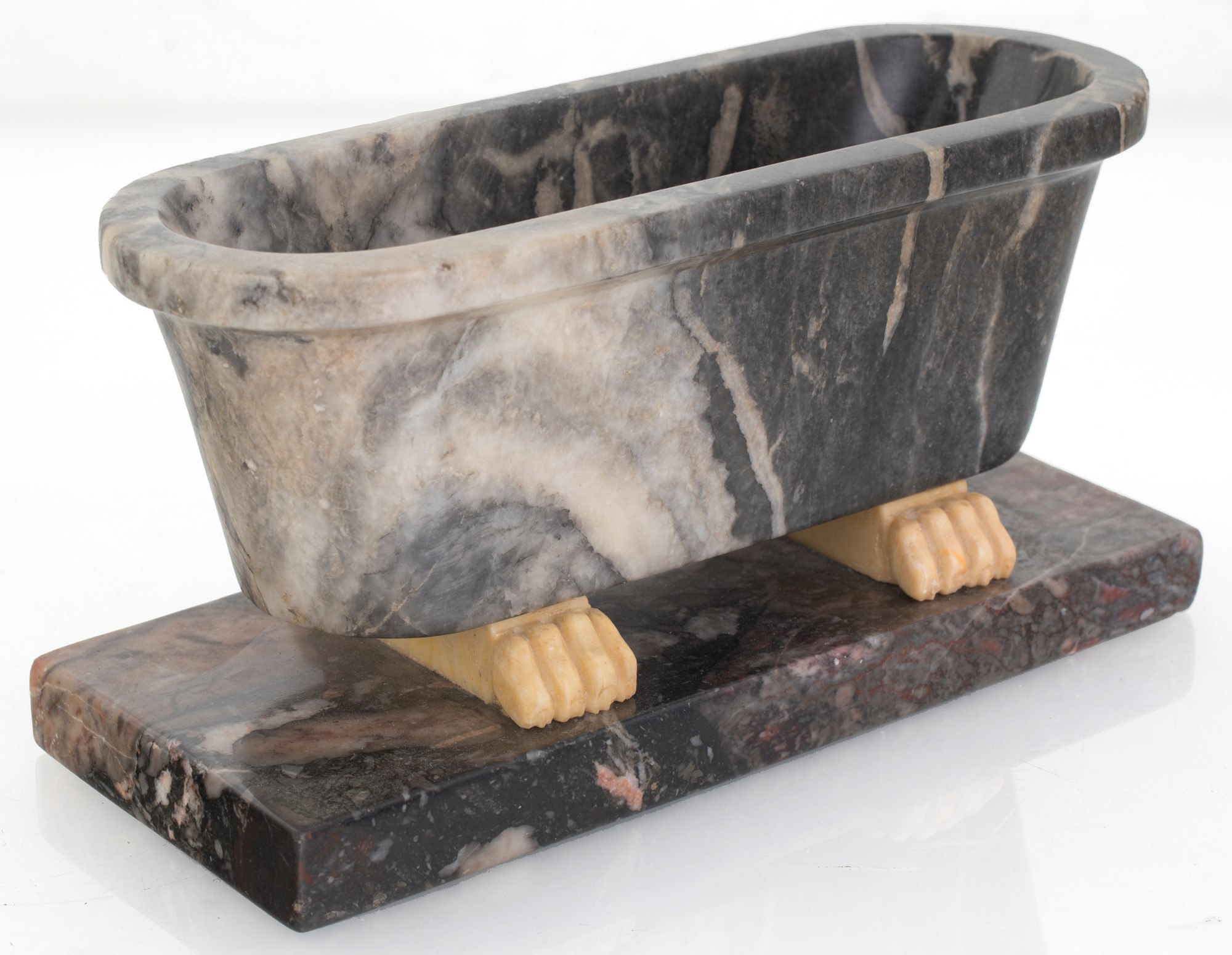 Vaschetta ovale in marmo sorretta da piedi ferini in giallo di Siena su base rettangolare in marmo nero africano, 9x18x7,5
