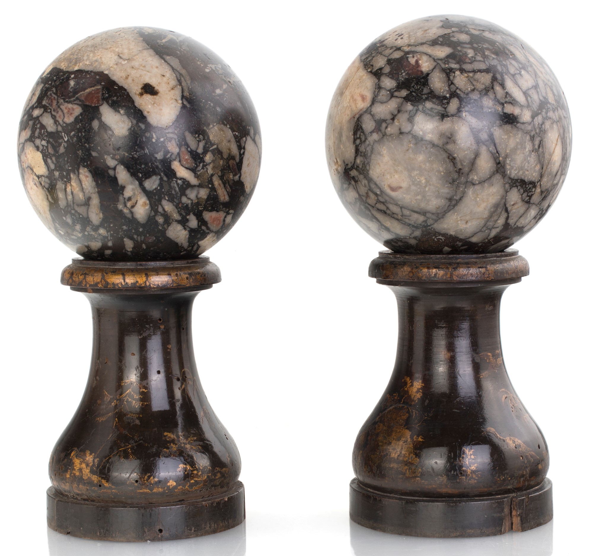 Coppia di sfere in breccia africana, XVIII secolo su piedistalli in legno laccato decorati a chinoiséries dorate su fondo nero , altezza complessiva cm 28
