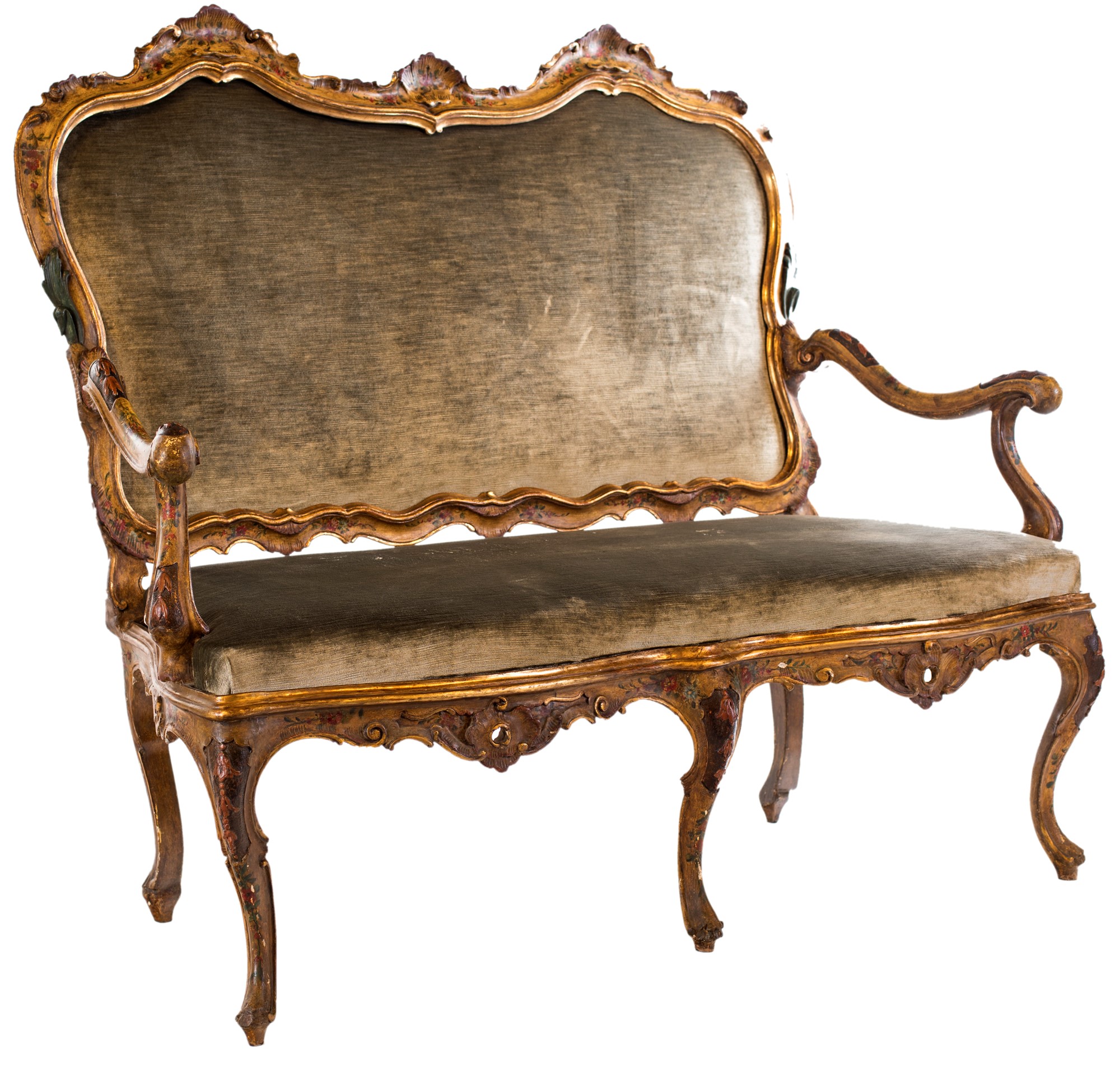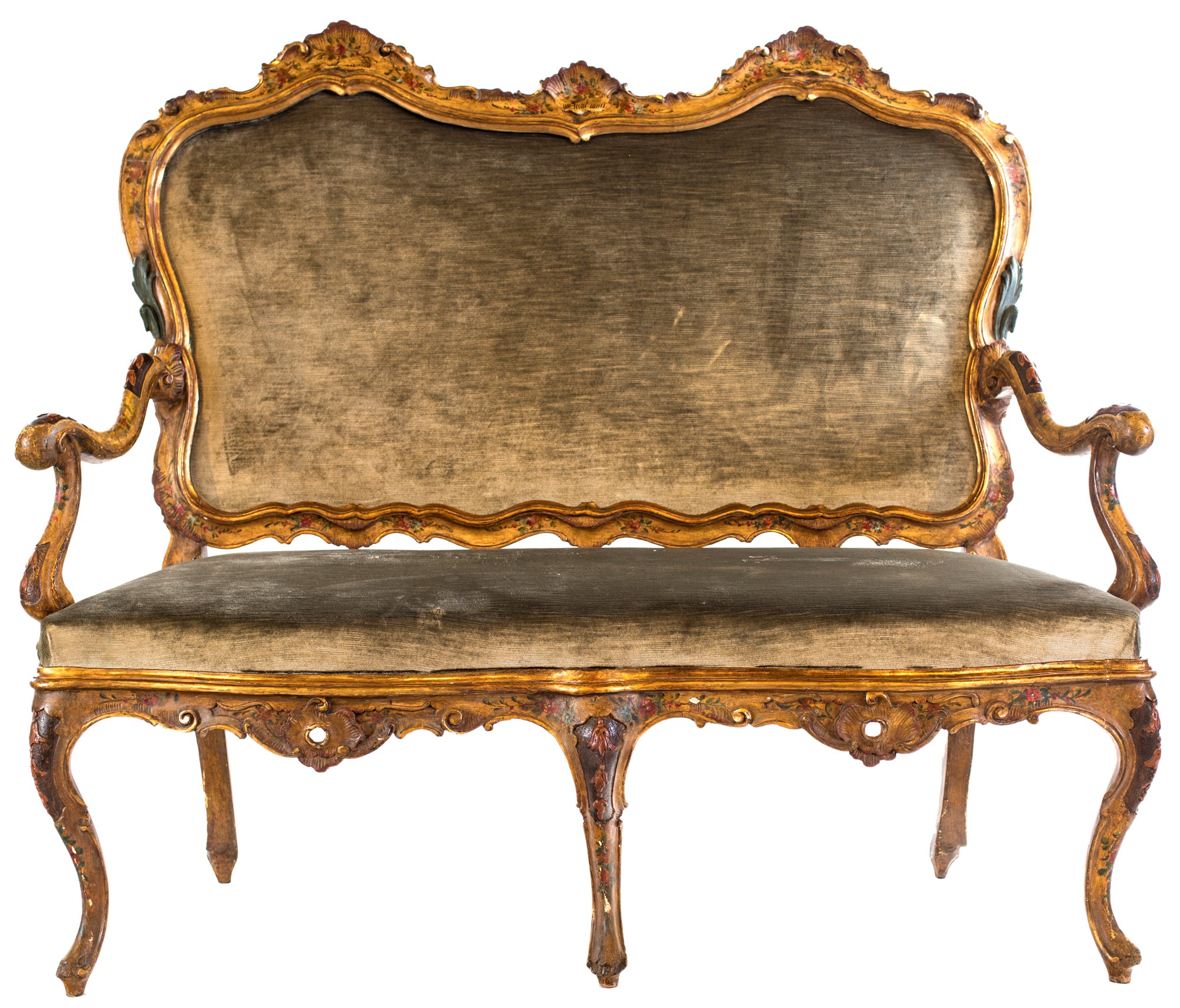 Divano in legno dorato, Venezia, metà del XVIII secolo con cornici sagomate decorate da composizioni floreali dipinte in vivace policromia; schienale e sedile imbottiti, braccioli e gambe mosse, 118x140x55