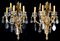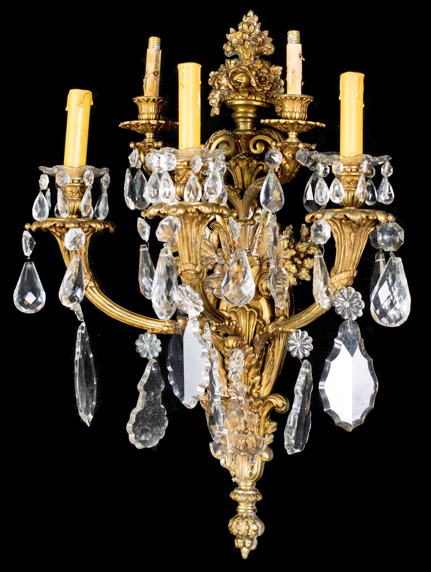 Coppia di appliques in bronzo dorato a cinque luci, XIX secolo con bracci arricchiti da pendenti in cristallo, 70x40x23