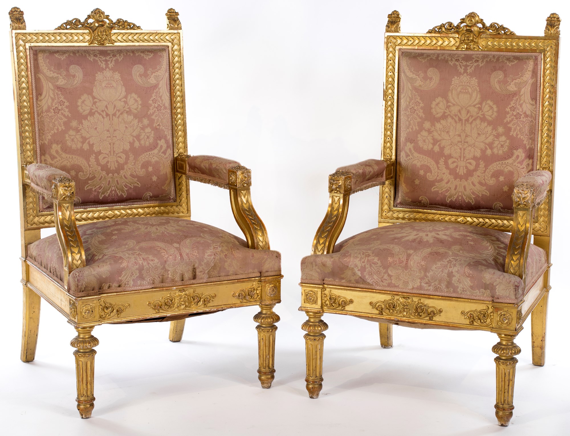 Coppia di poltrone in legno dorato, prima metà del XIX secolo di forma squadrata con cornici percorse da spighe intagliate, centrate da mascheroni sormontati da volute e motivi vegetali, motivi decorativi ripresi lungo la fascia sottosedile; schienali, sedili e braccioli imbottiti, gambe anteriori rastremate scanalate, 110x60x64