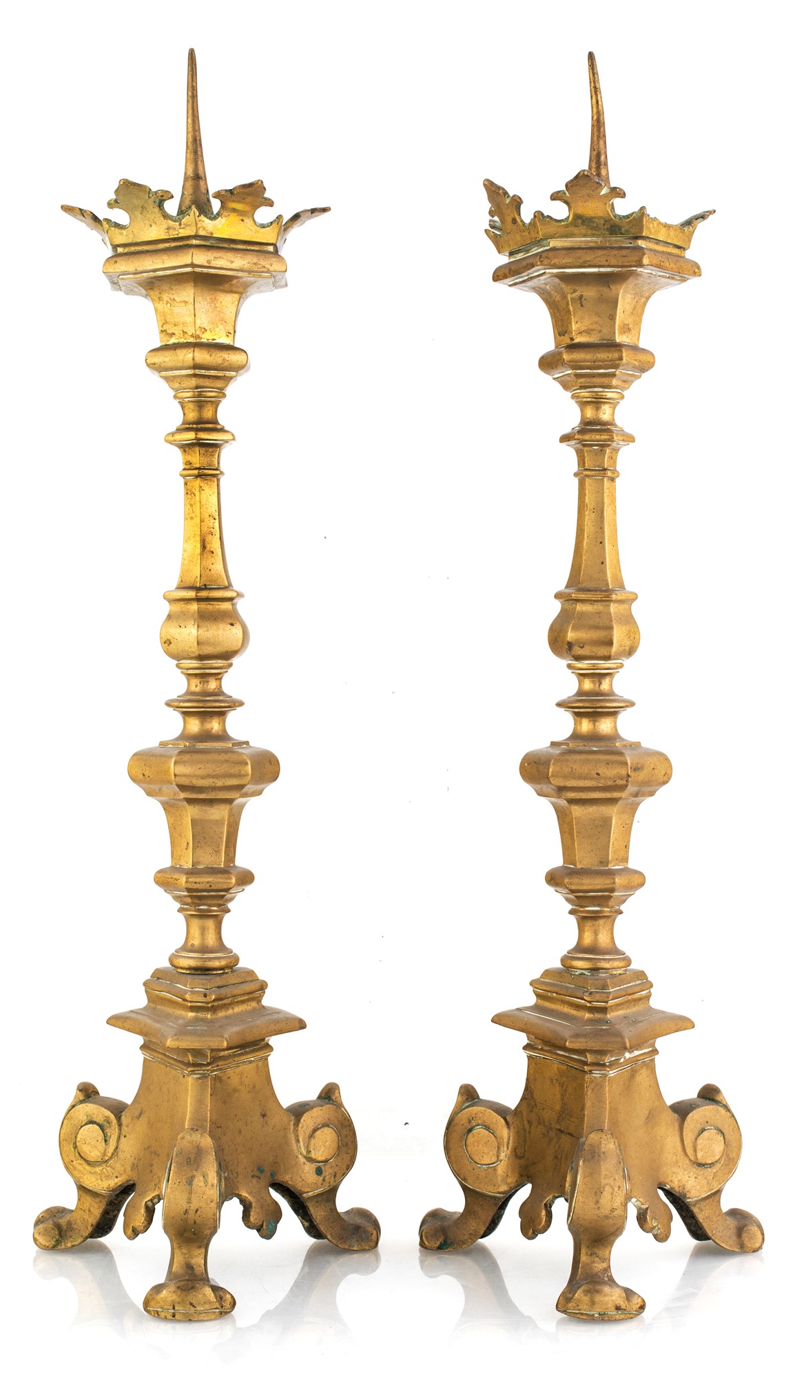 Lotto 69 | Coppia di torciere in bronzo dorato, XVII secolo con fusto tornito su base...