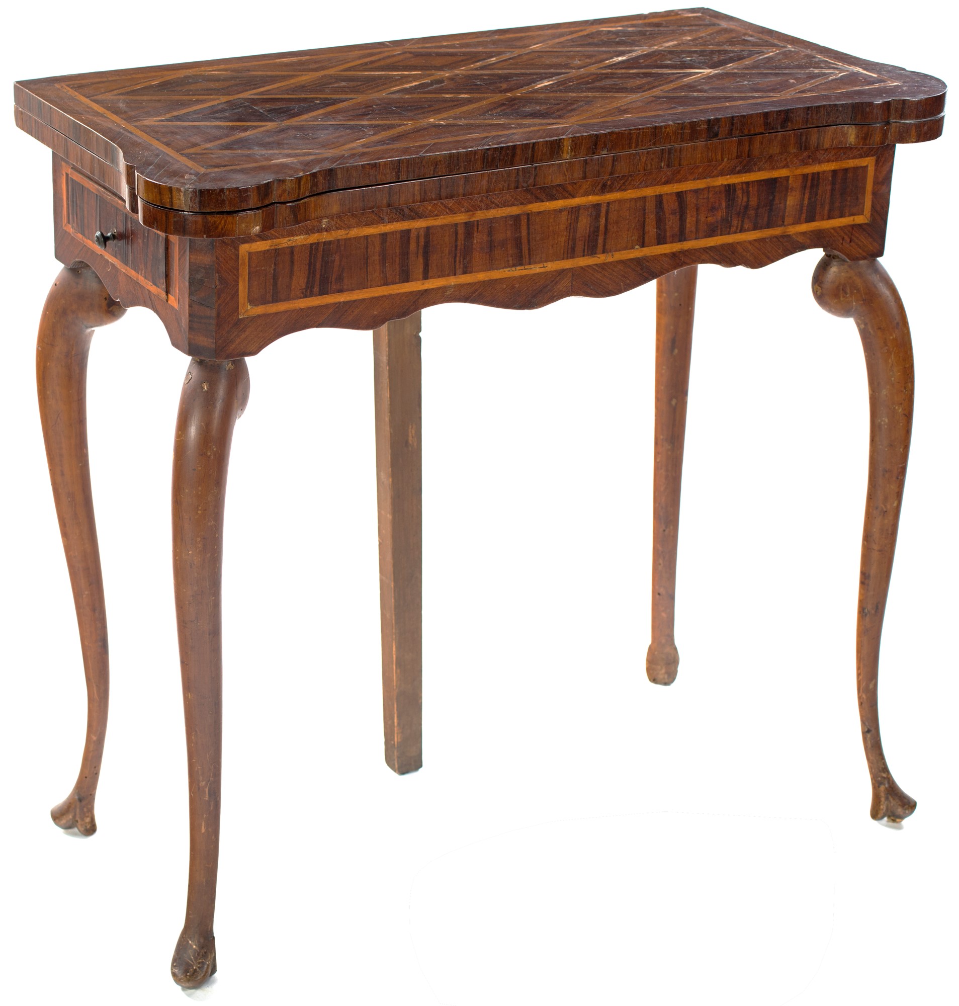 Tavolino da gioco impiallacciato in palissandro, Genova XVIII secolo con piano a libretto intarsiato a losanghe in carrubo definite da filettature in legno di frutto; due tiretti diametralmente opposti, gambe sagomate terminanti a pied de biche. Difetti , 77x80x40
