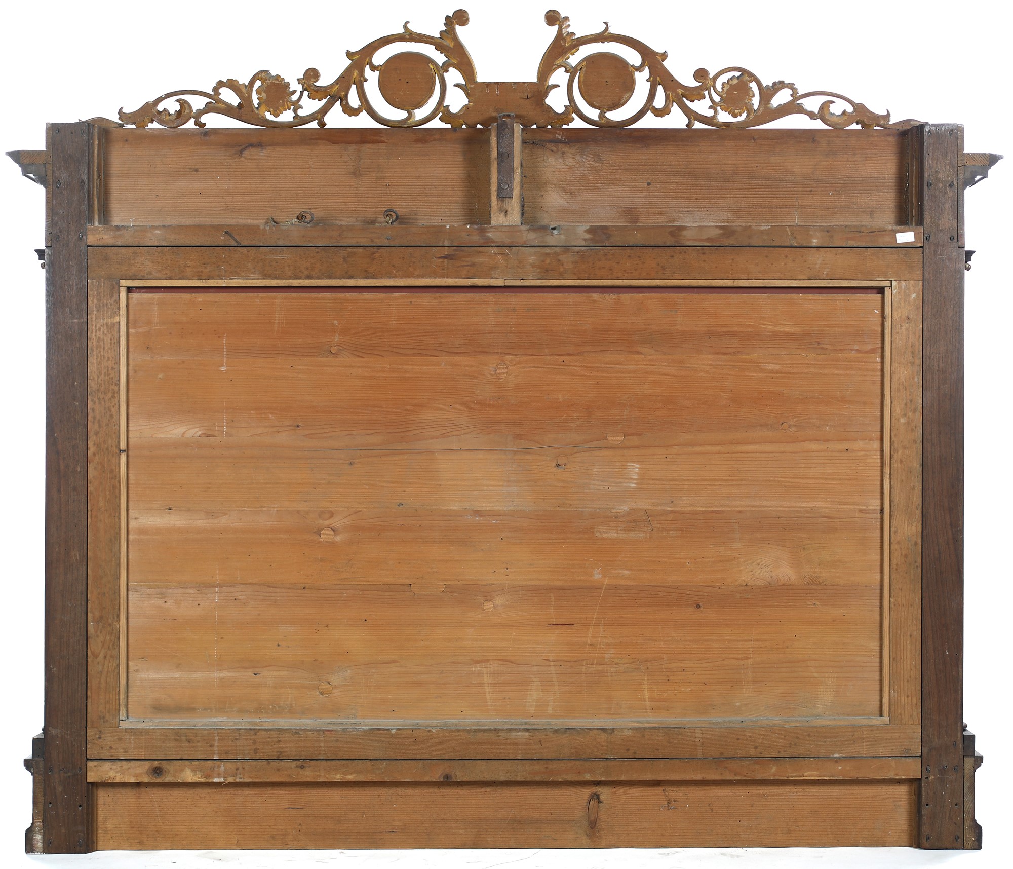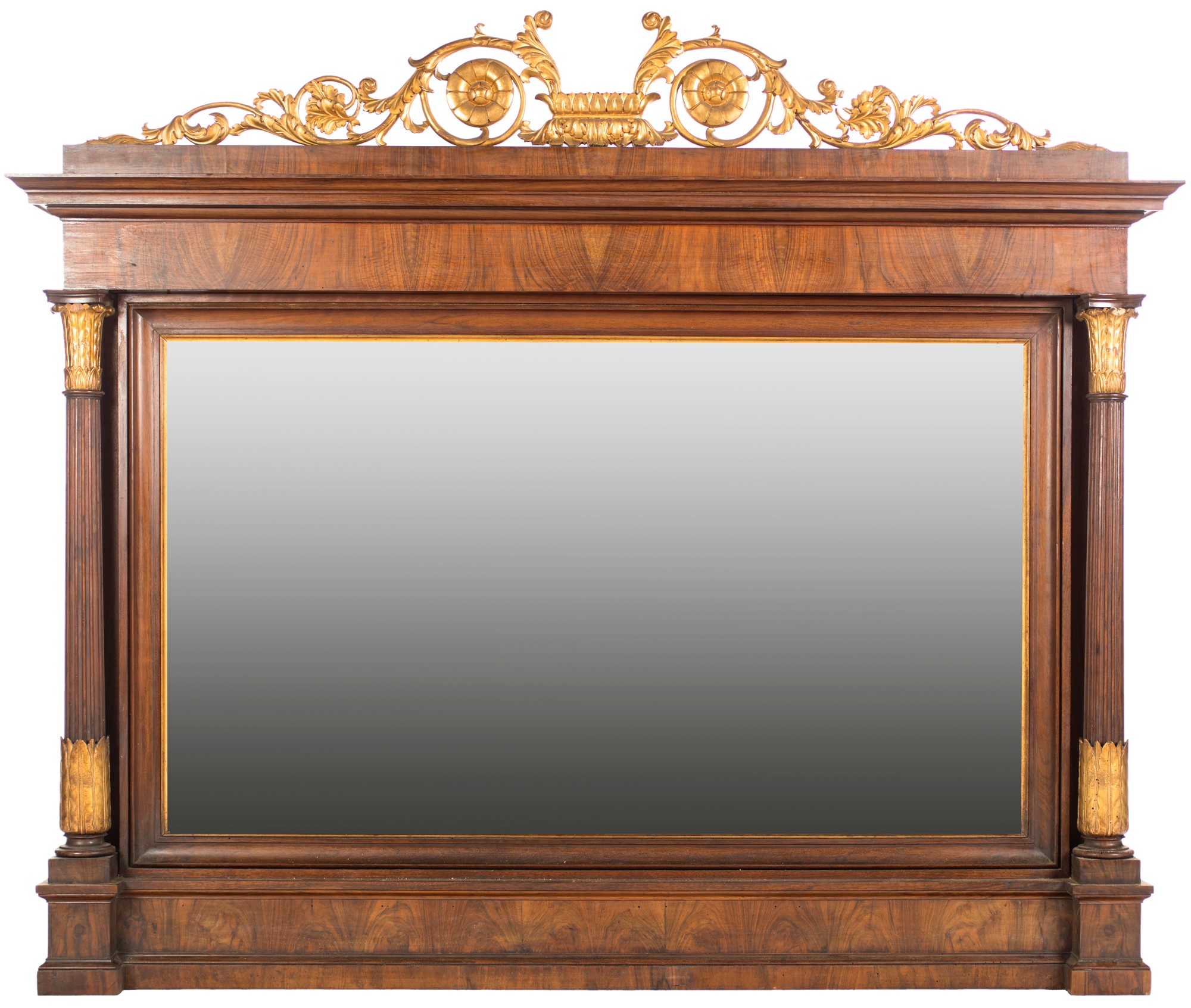 Caminiera in mogano d'epoca Impero delimitata da colonne scanalate con base e capitello intagliati in forma di cespo fogliaceo dorato; profilo superiore impreziosito da un fregio a girali contrapposte che si snodano da un elemento centrale. Mancanze, 135x157x12