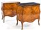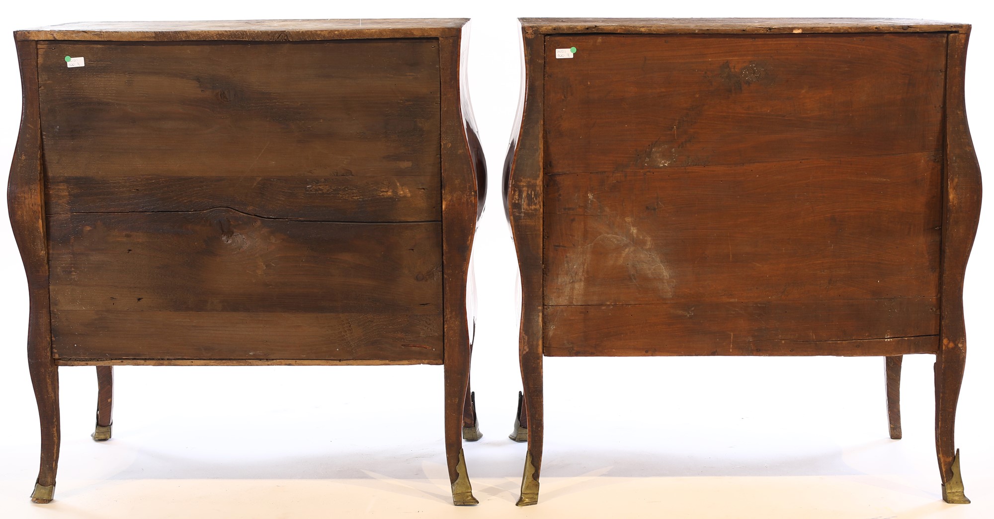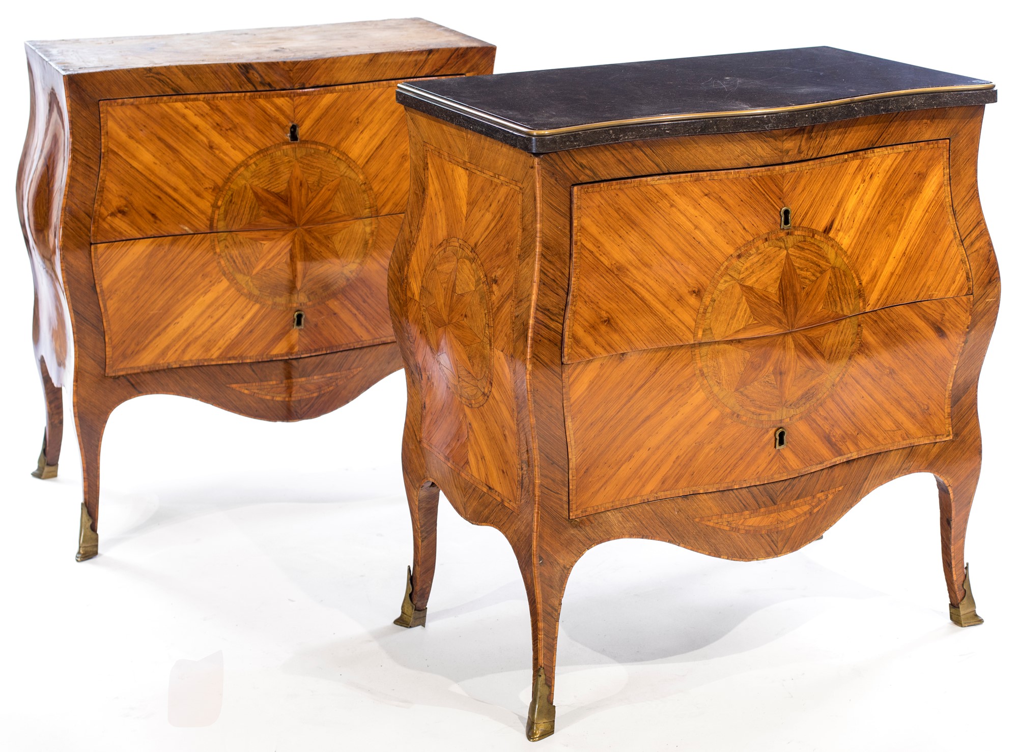Coppia di cassettoni in legno di rosa, Napoli, metà del XVIII secolo con specchiature a fibre contrapposte centrate da stella intarsiata; di forma sagomata definita da spigoli curvilinei, recano ognuno due cassetti frontali privi di traversa; gambe sfuggenti calzate di scarpette. Restauri e rifacimenti. Un piano in marmo mancante, 84x77x45