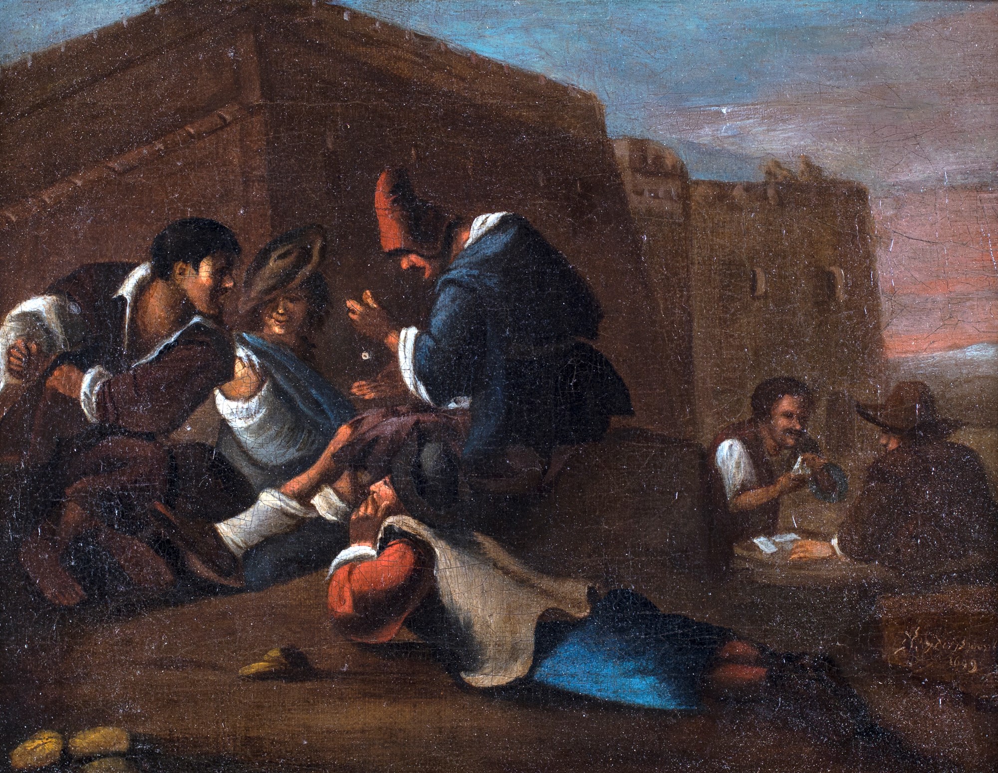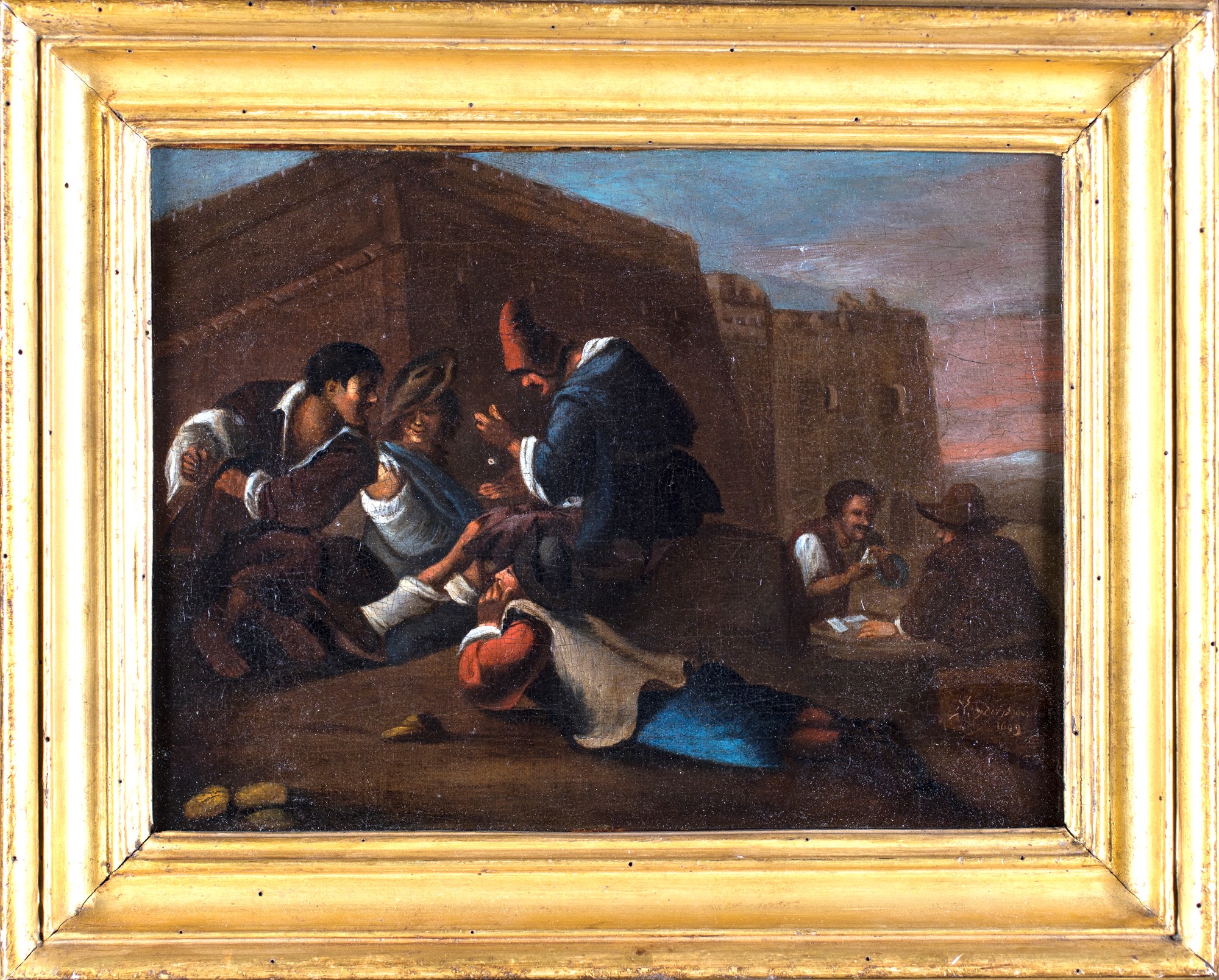 Pittore bambocciante del XVII secolo, Giocatori di dadi e di carte Iscritto...