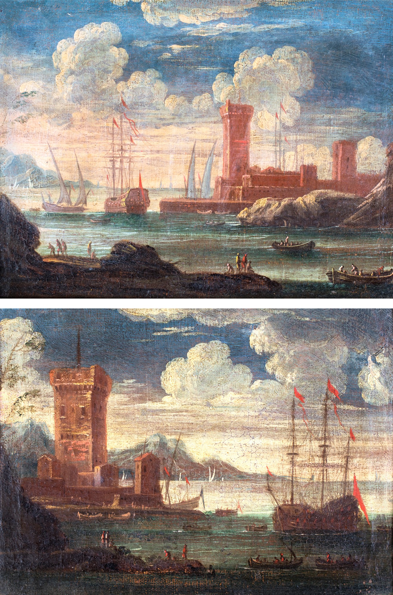 Pittore fine XVII/inizio XVIII secolo, Marina con galeone ed altre imbarcazioni coppia di olii su tela, 26x36