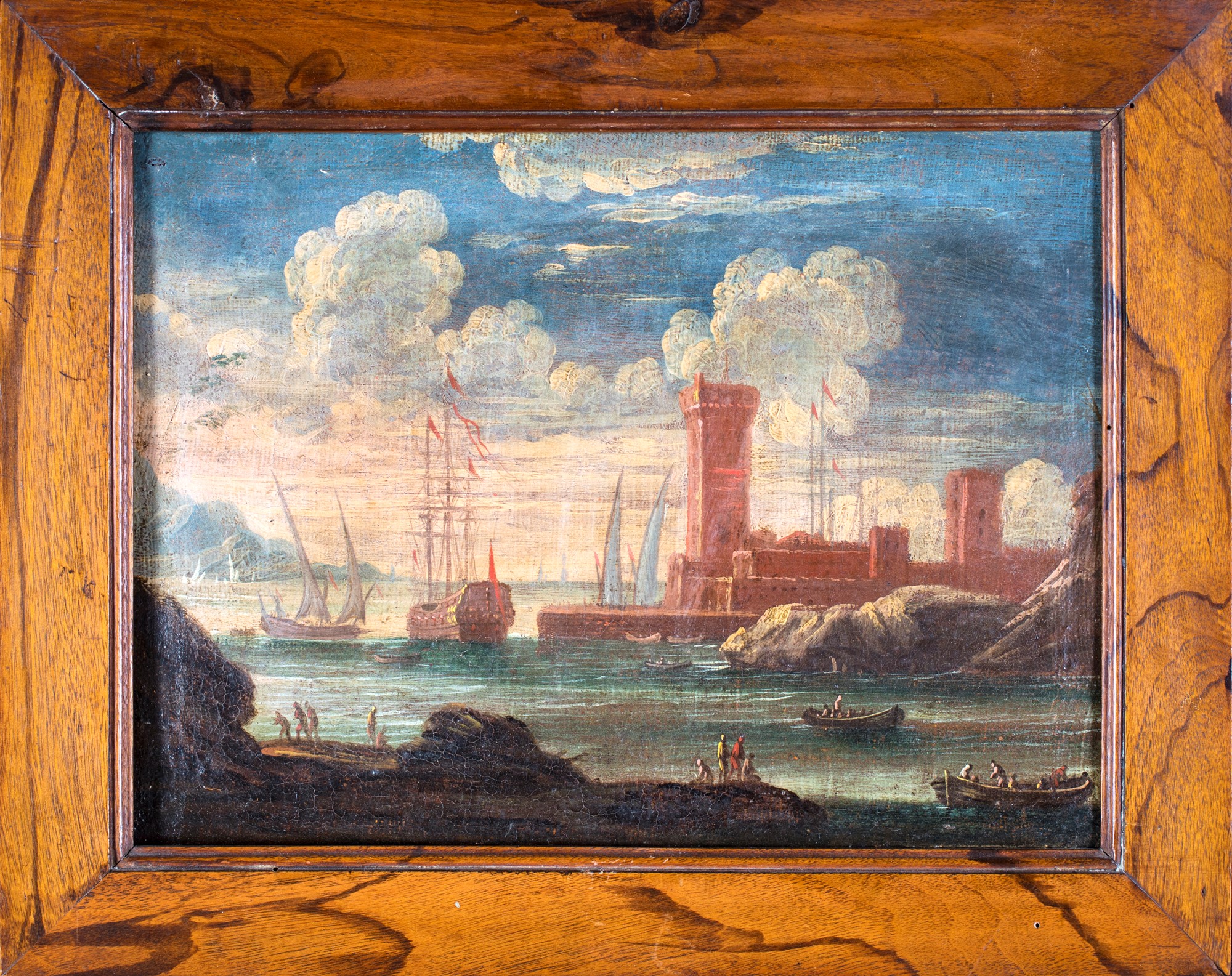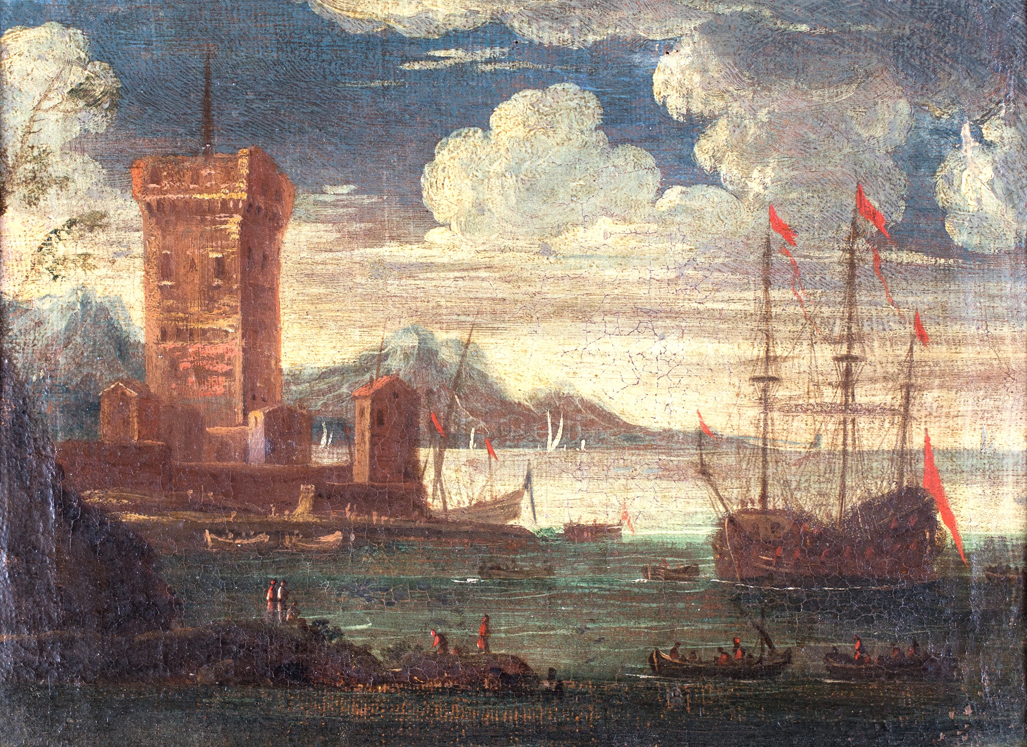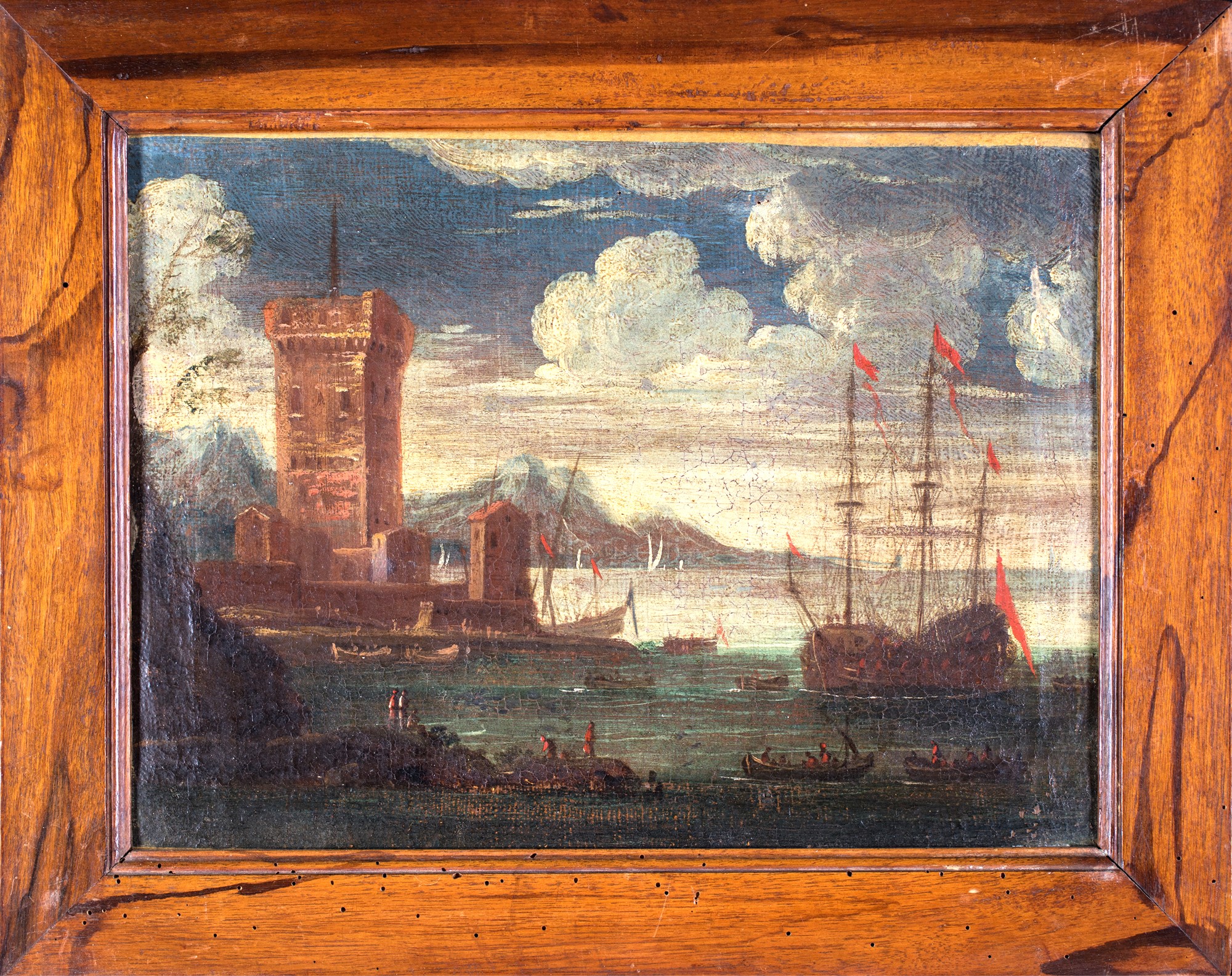 Pittore fine XVII/inizio XVIII secolo, Marina con galeone ed altre...
