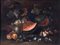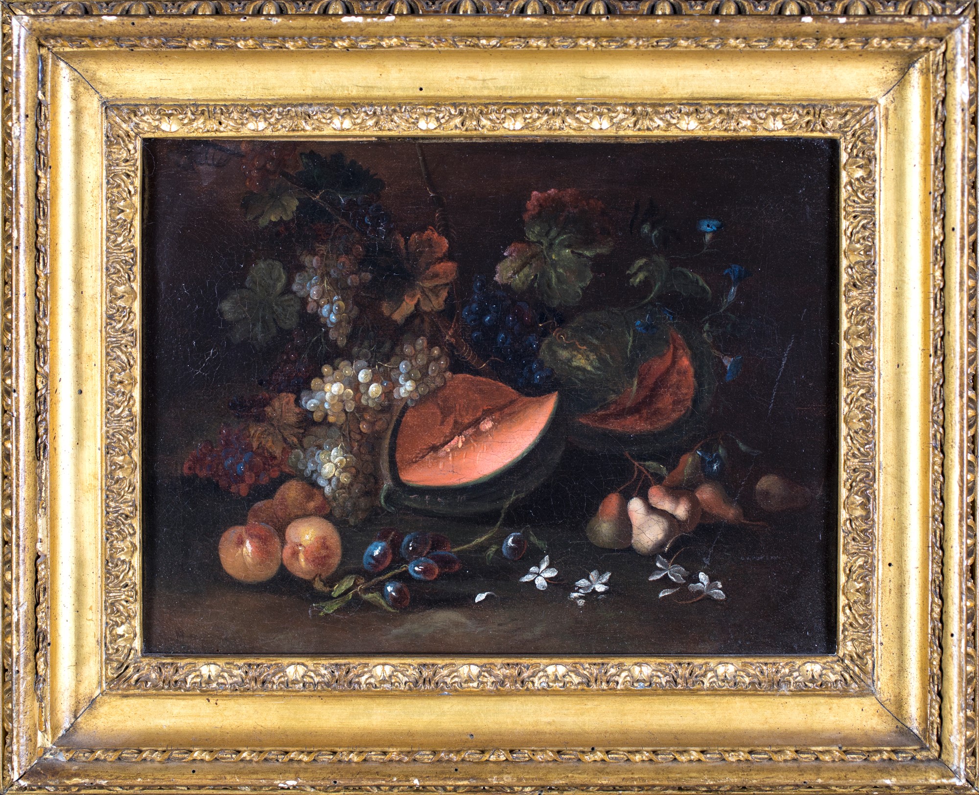 Pittore romano del XVII secolo, Natura morta di frutta con uva e melone olio...