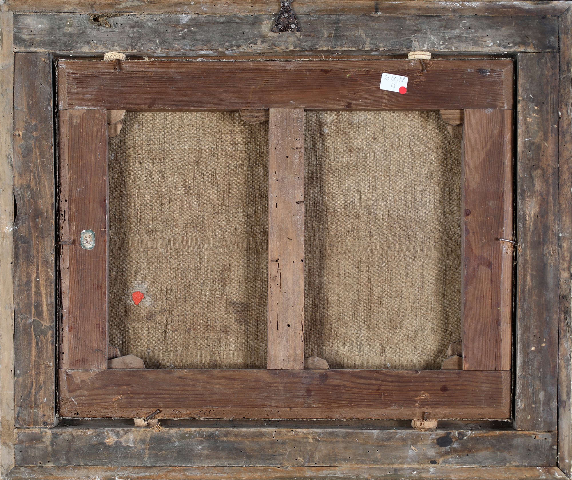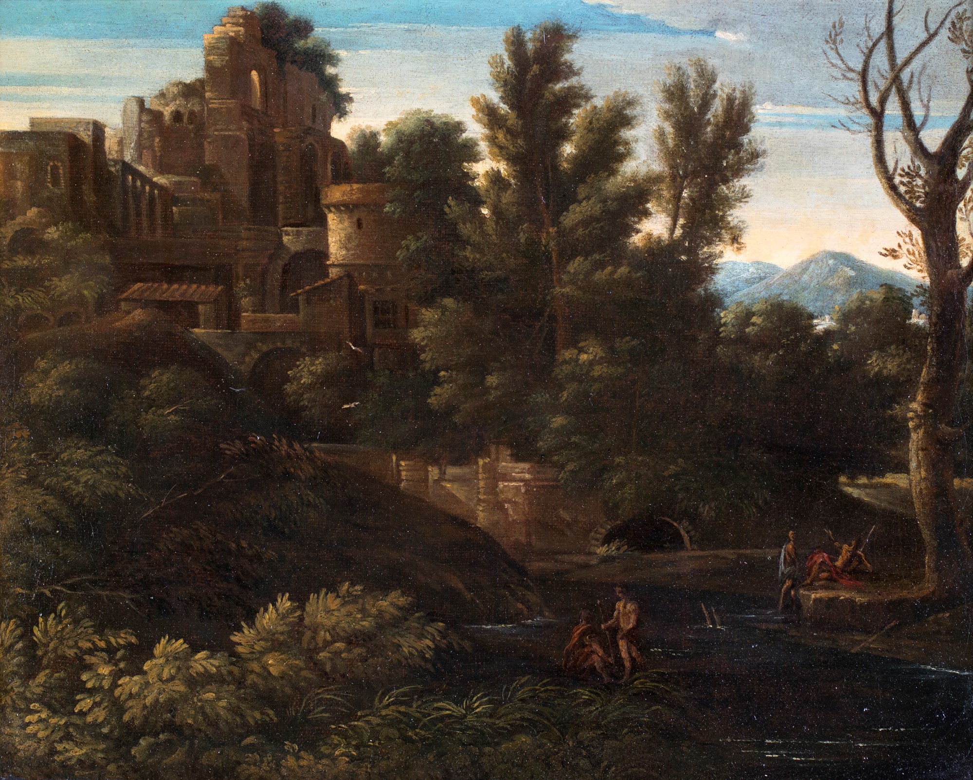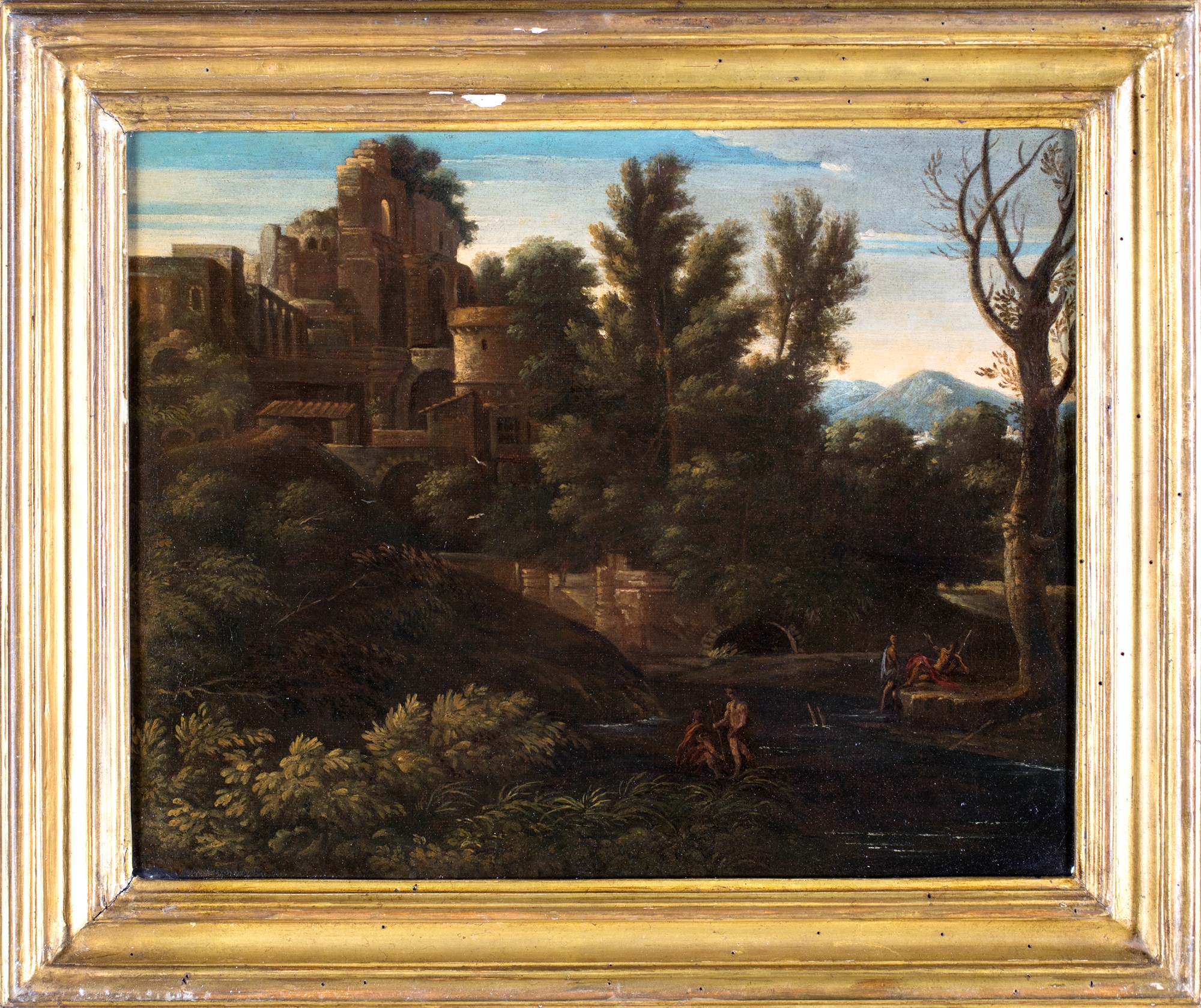 Gaspard Dughet (attribuito), Paesaggio con borgo e figure olio su tela, 37x47