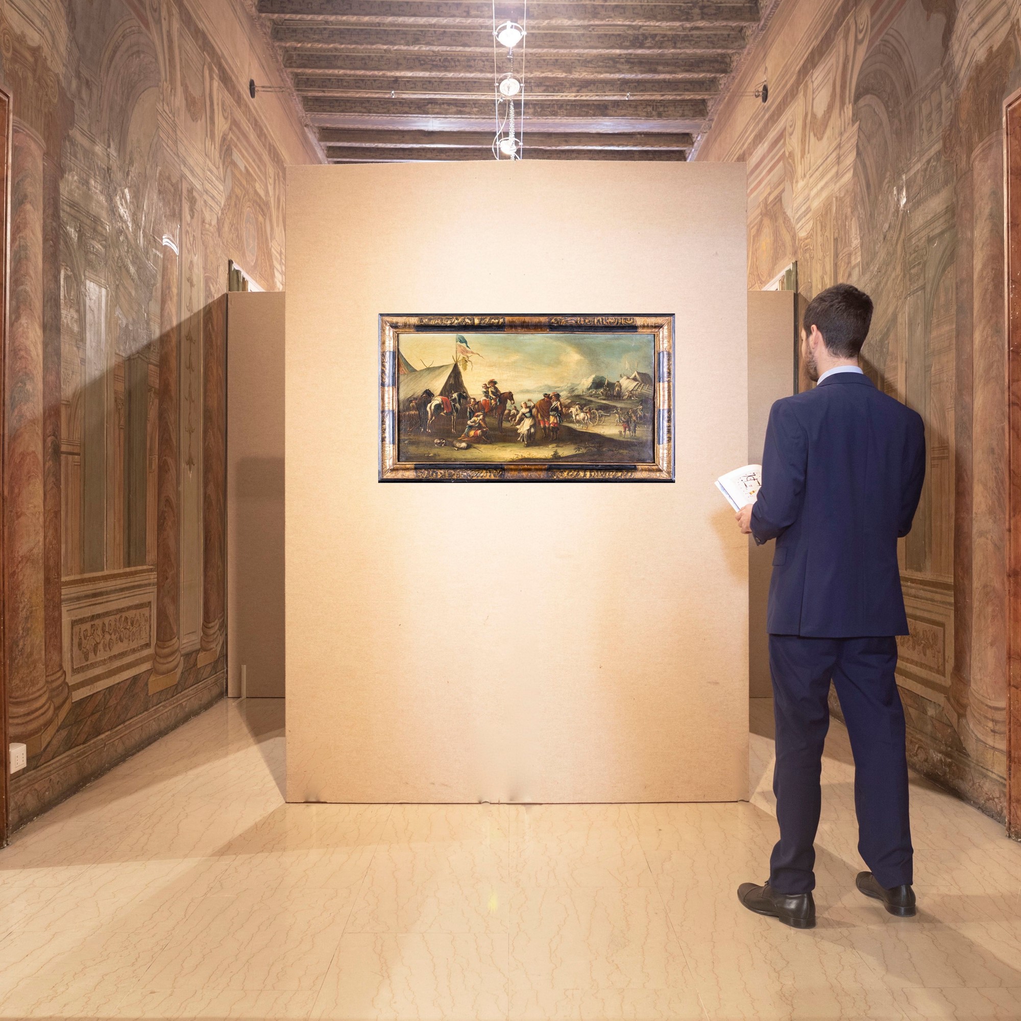 Philips Wouwermann, Accampamento militare con soldati e donne che ballano e suonano davanti ad una tenda.olio su tela, 55x108