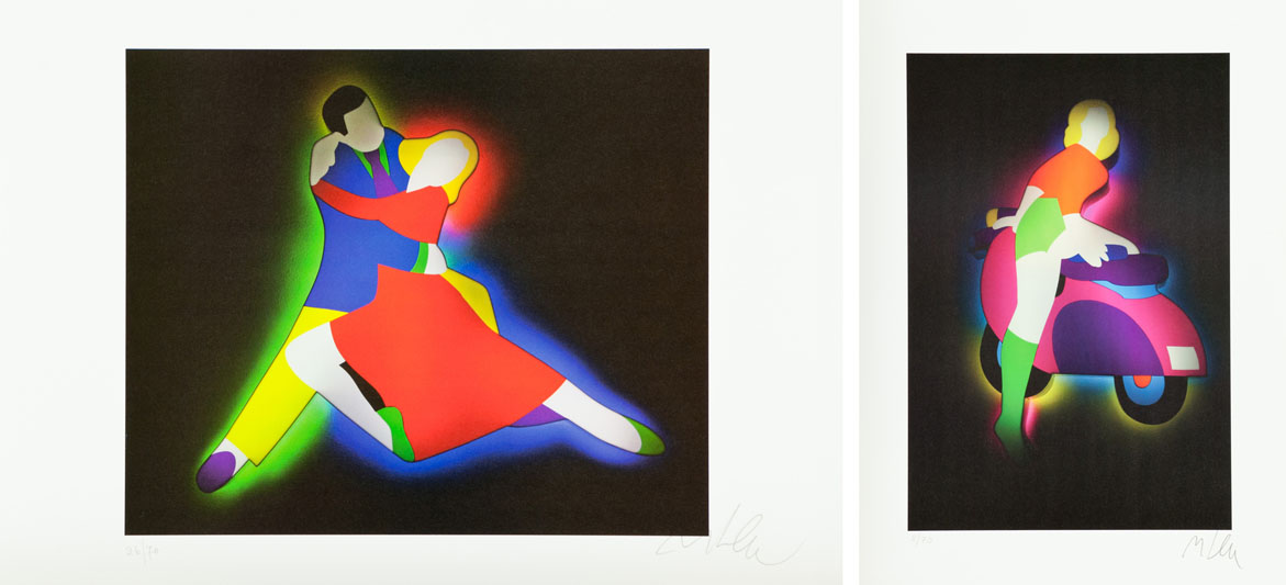Marco Lodola Lotto unico di due Opere - "Ballerini", Litografia su carta, cm. 34x48, es. 26/70, firma in basso a destra, tiratura in basso a sinistra; - "Vespa", Litografia su carta, cm. 48x34, es. 8/70, firma in basso a destra, tiratura in basso a sinistra.
