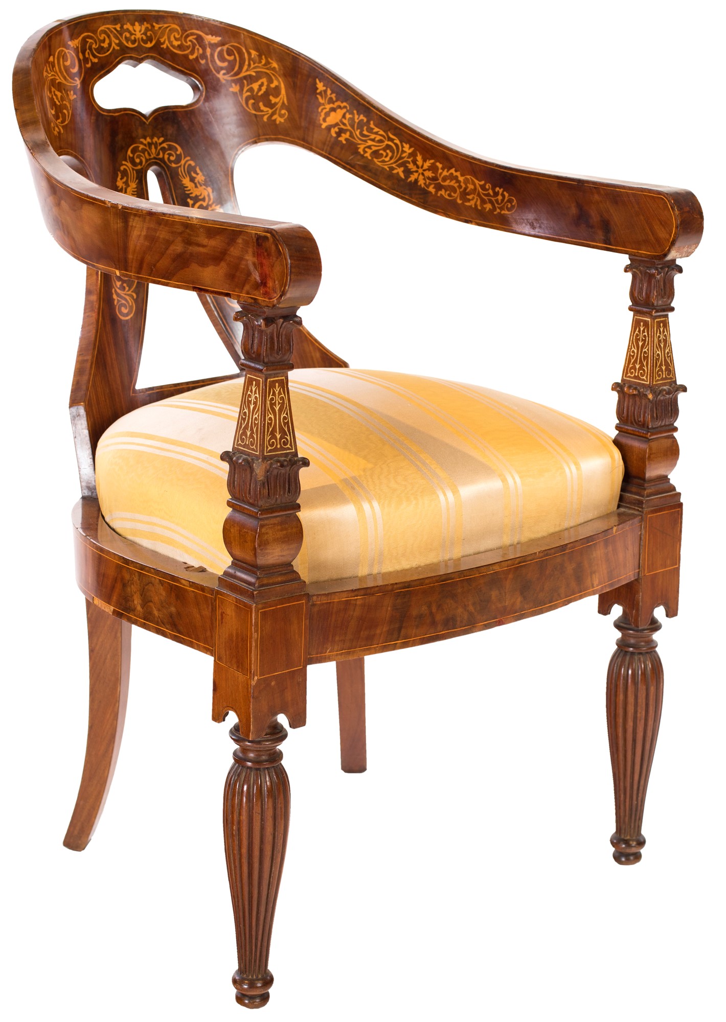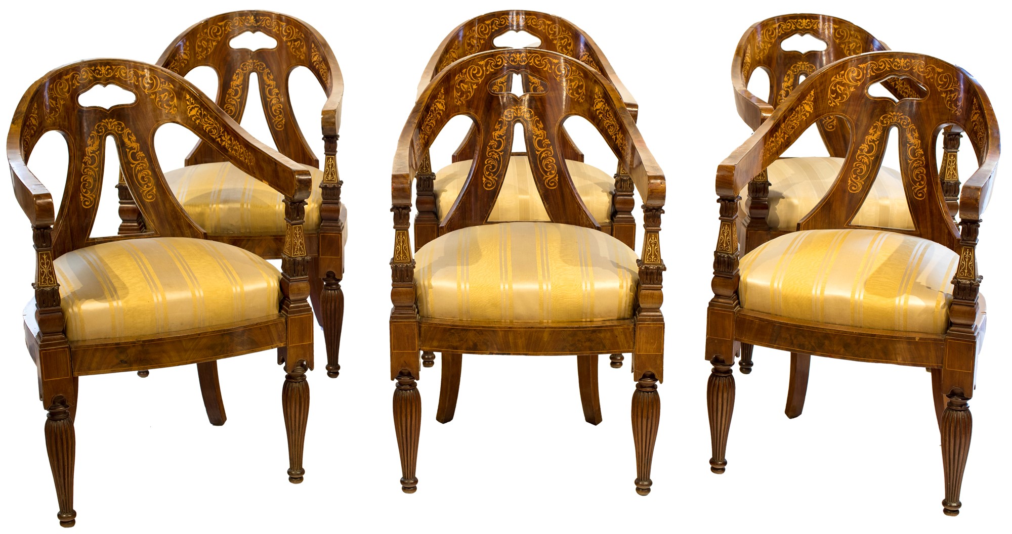 Sei poltrone di linea avvolgente in palissandro con intarsi in acero, Napoli, metà del XIX secolo con cornici decorate da composizioni fitomorfe entro sottili filettature lineari; schienali a giorno sostenuti da montanti a balaustro squadrato abbellito da rilievi vegetali e intarsi, sedili imbottiti, gambe anteriori affusolate e baccellate, posteriori a sciabola, 87x55x53