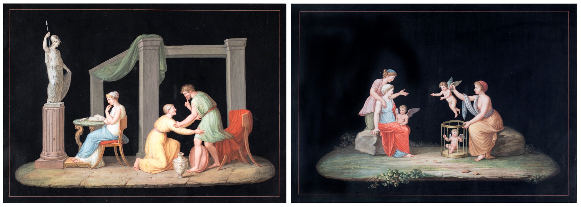Pittore del XIX secolo, a) Interno pompeiano b) Mercantessa di Amore coppia...
