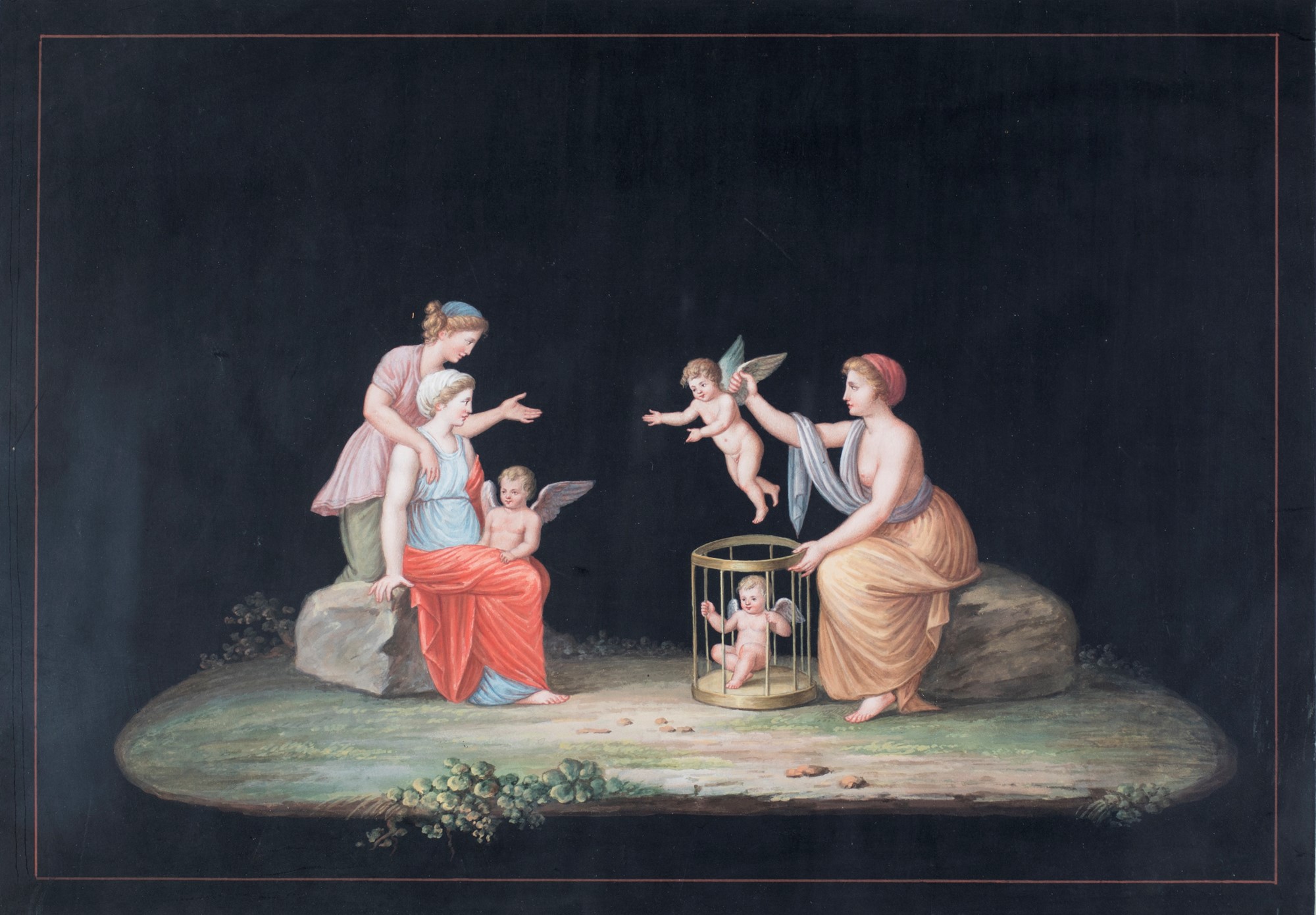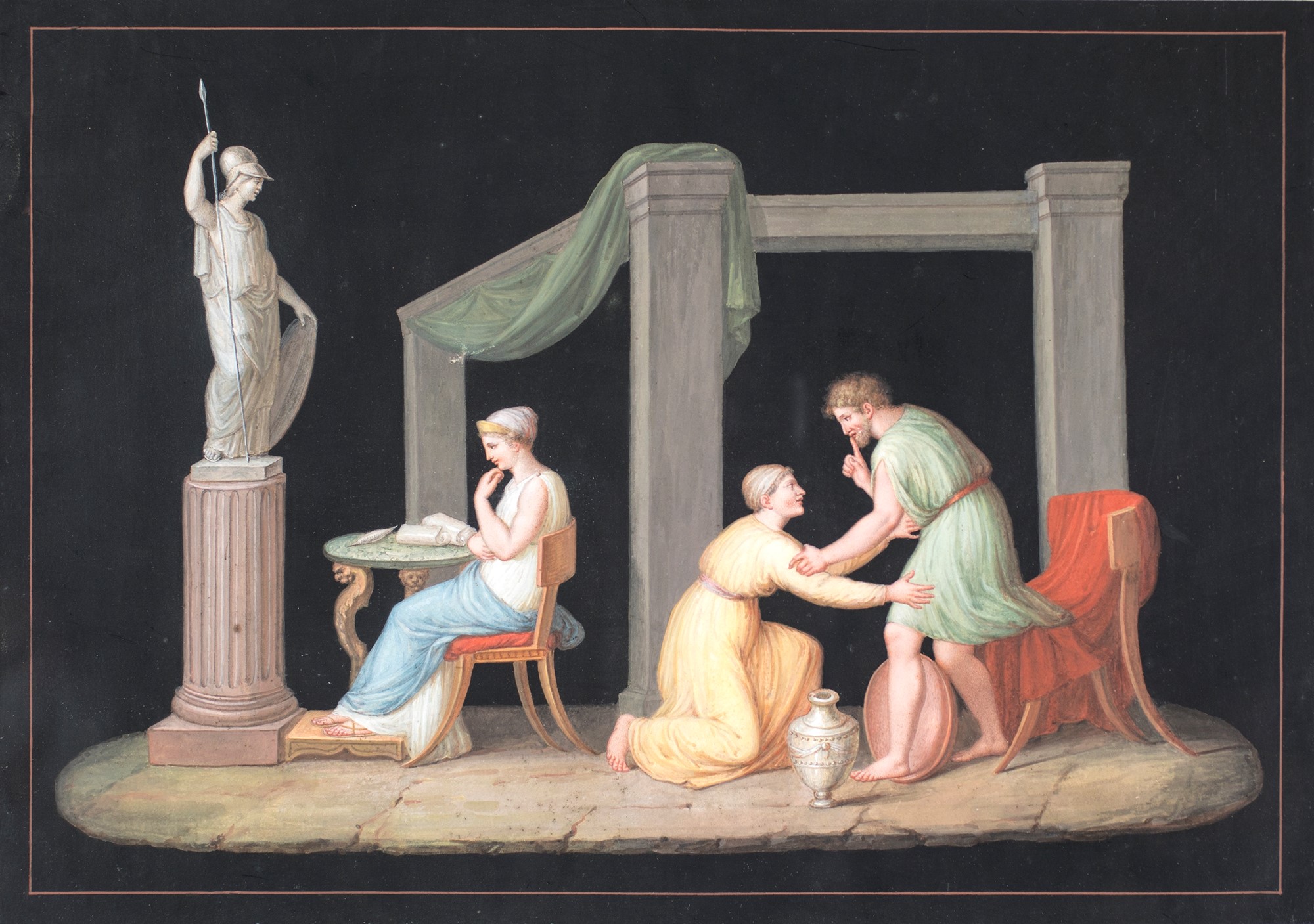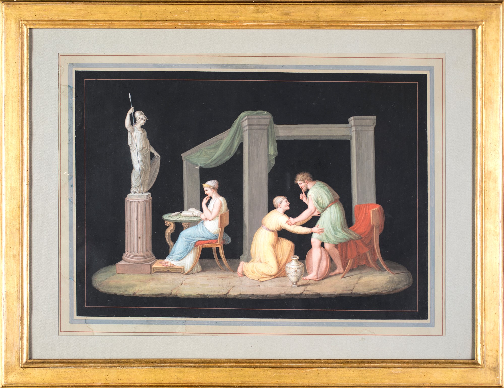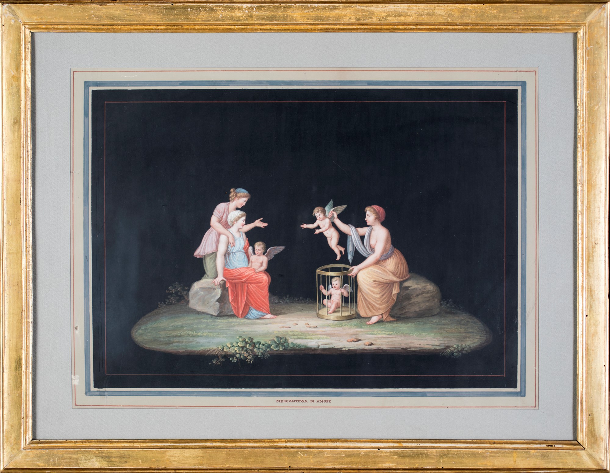 Pittore del XIX secolo, a) Interno pompeiano b) Mercantessa di Amore coppia di tempere su carta, 60x77 con la cornice