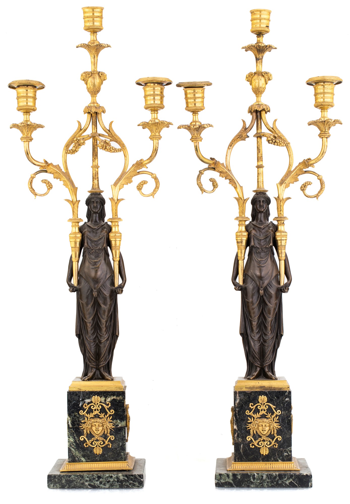 Coppia di candelabri a tre luci in bronzo brunito e dorato, Francia, periodo dell'Impero con figure di vestale su piedistalli squadrati in marmo verde decorati da applicazioni dorate in forma di mascherone e anfore classiche, altezza cm 66