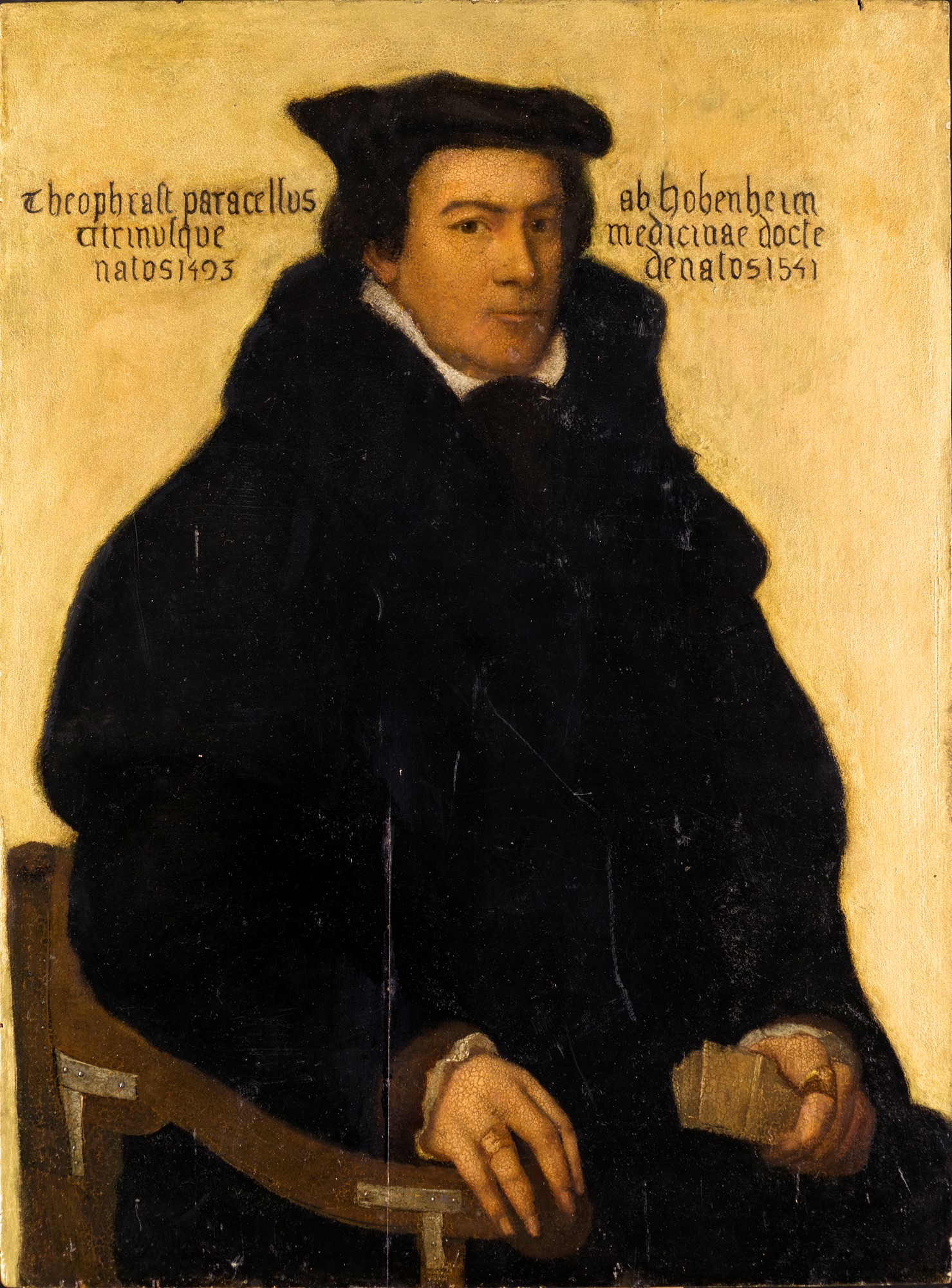 Pittore fine XVII/inizio XVIII secolo , Ritratto di Paracelso F2, olio su tavola fondo oro, 65x49