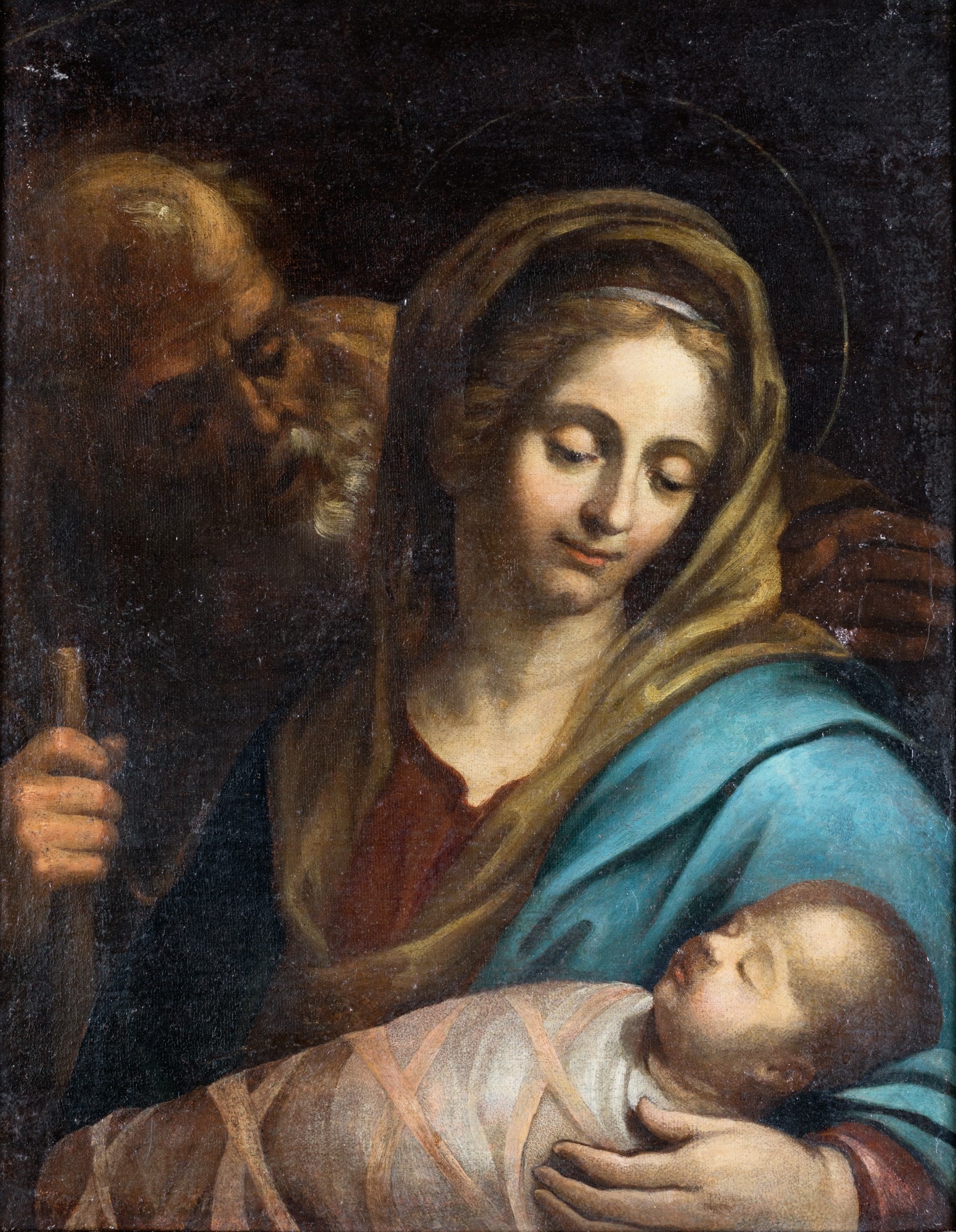 Pittore del XVII secolo , Sacra Famiglia con Gesù in fasce F2, olio su tela, 62x49