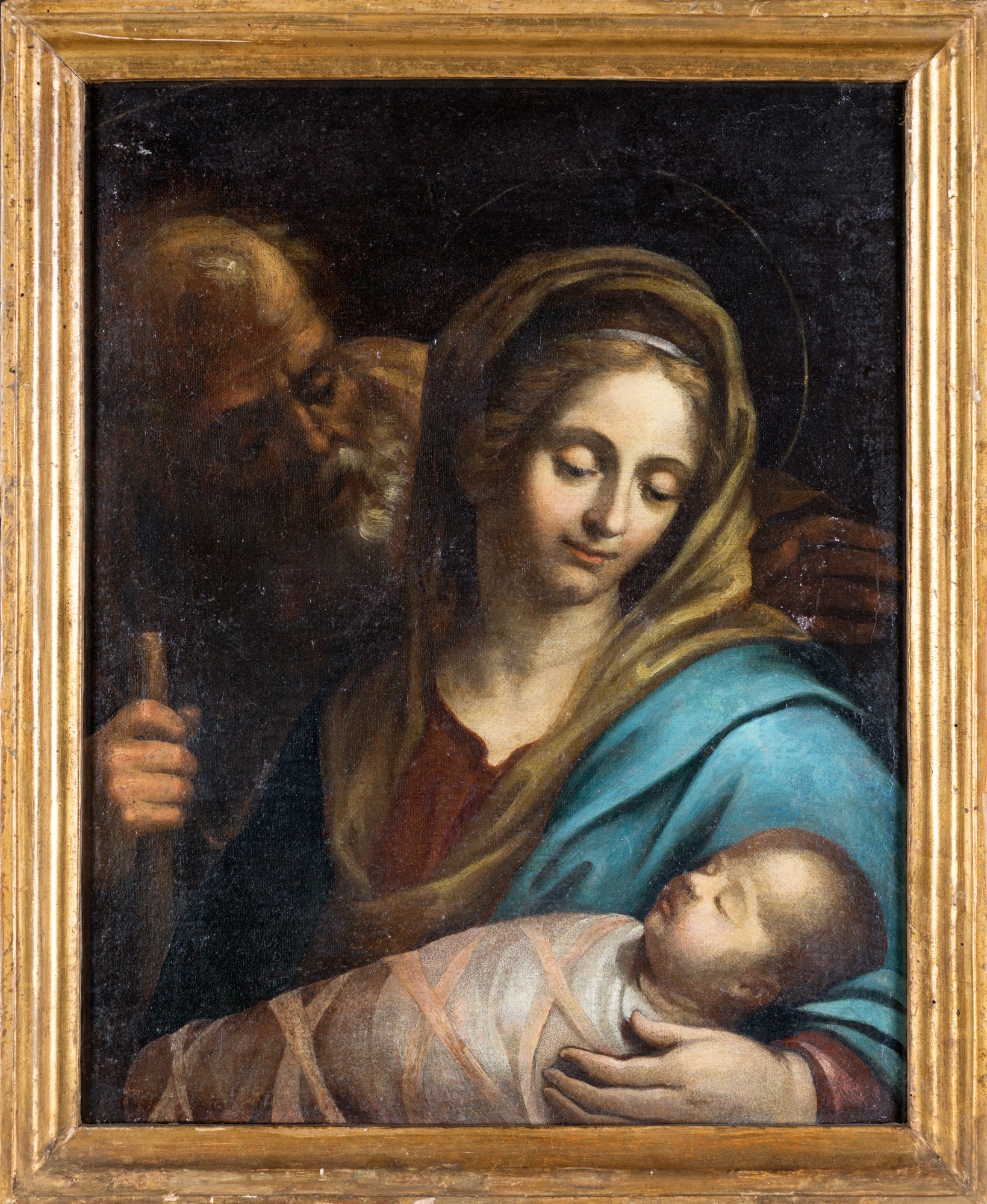 Pittore del XVII secolo , Sacra Famiglia con Gesù in fasce F2, olio su tela,...