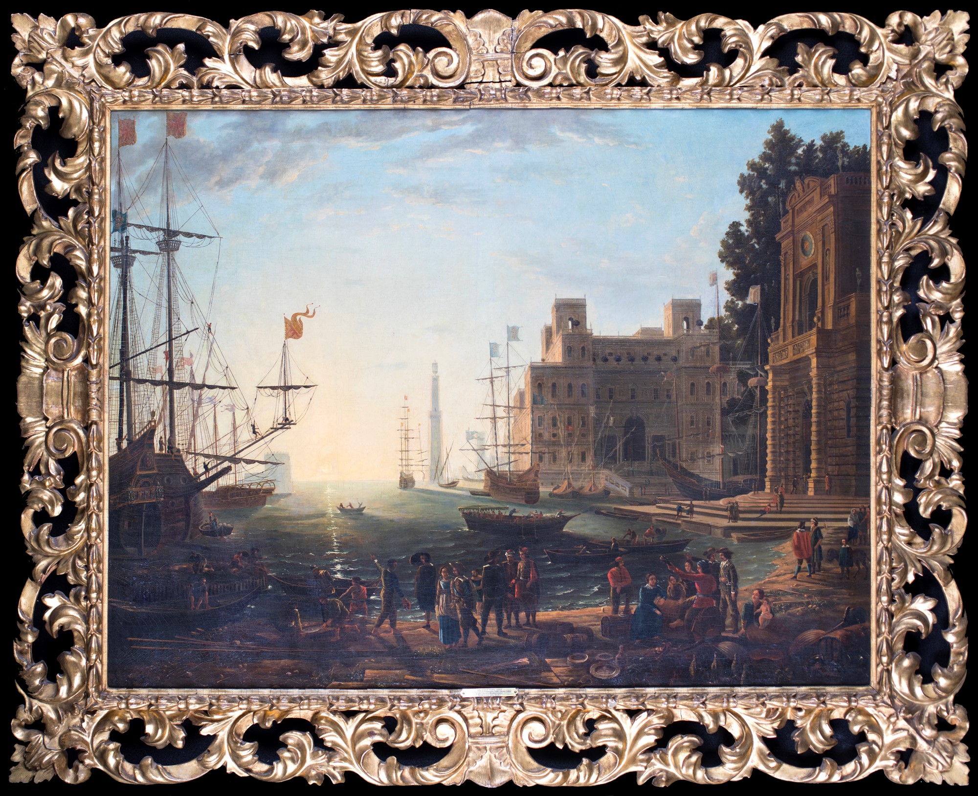 Pittore del XIX secolo , Porto marittimo con l'imbarco della regina di Saba (da Claude Lorrain) F2, olio su tela, 100x132