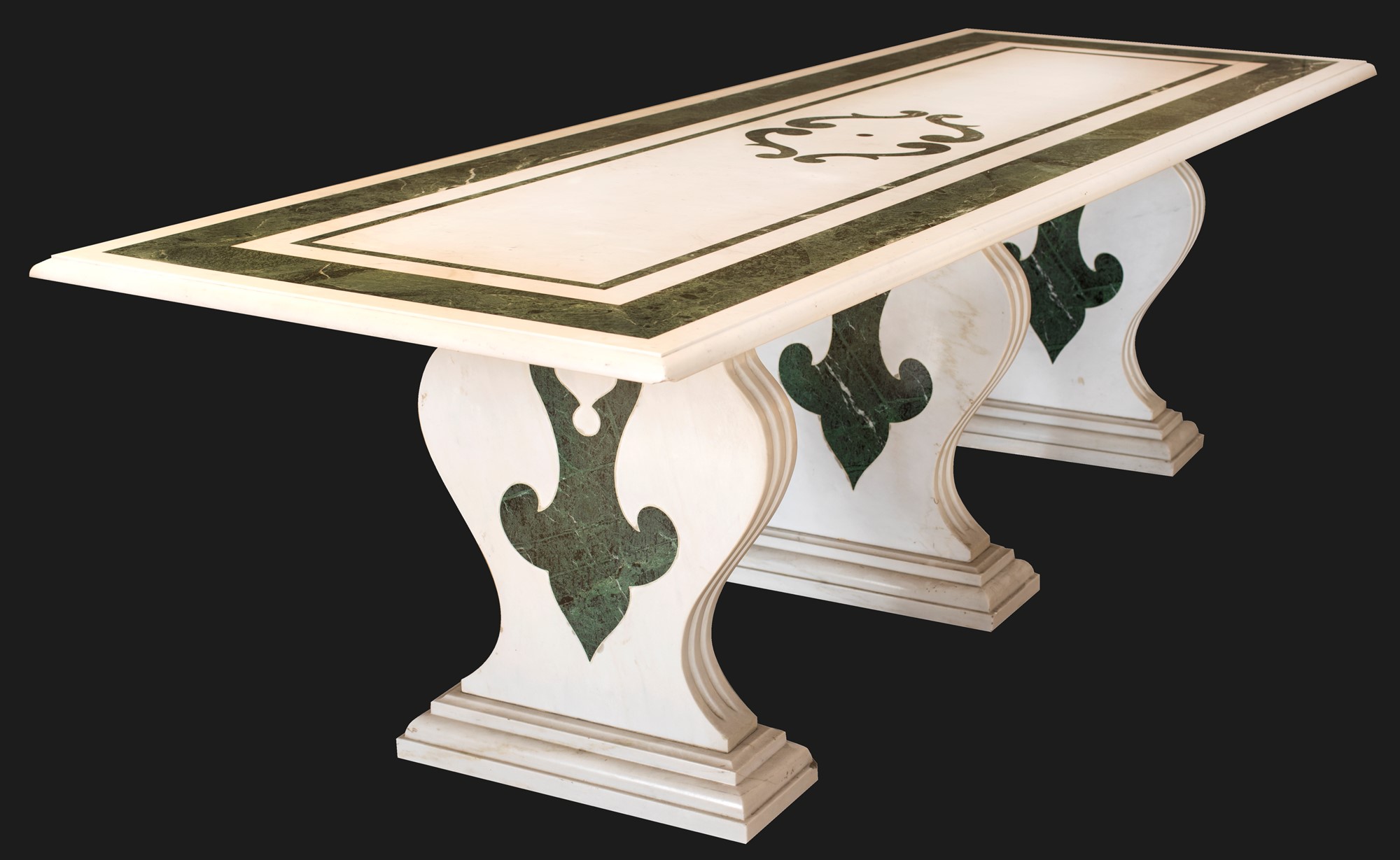 Tavolo in marmo bianco con inserti in verde F2, , 75x270x92
