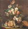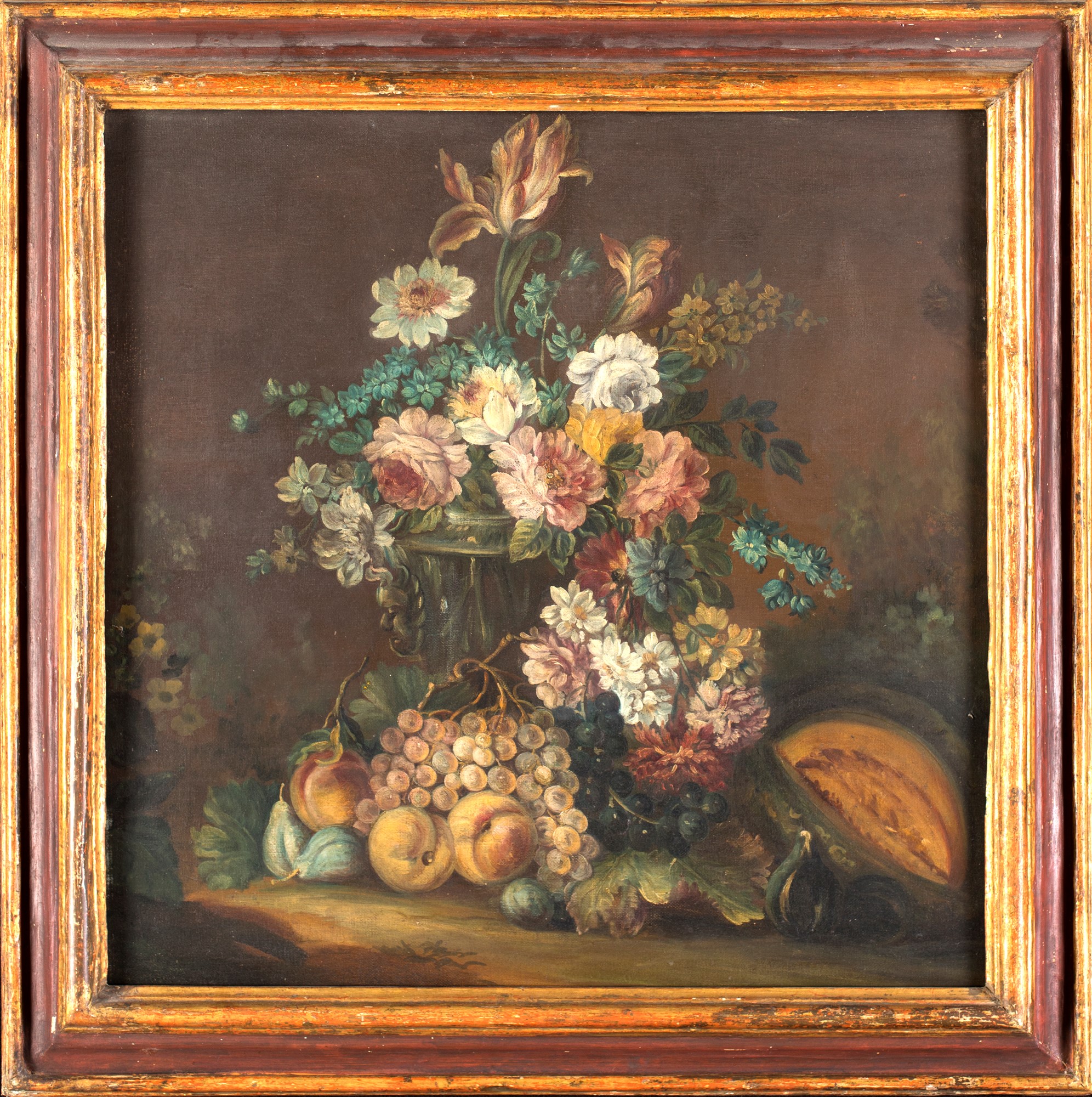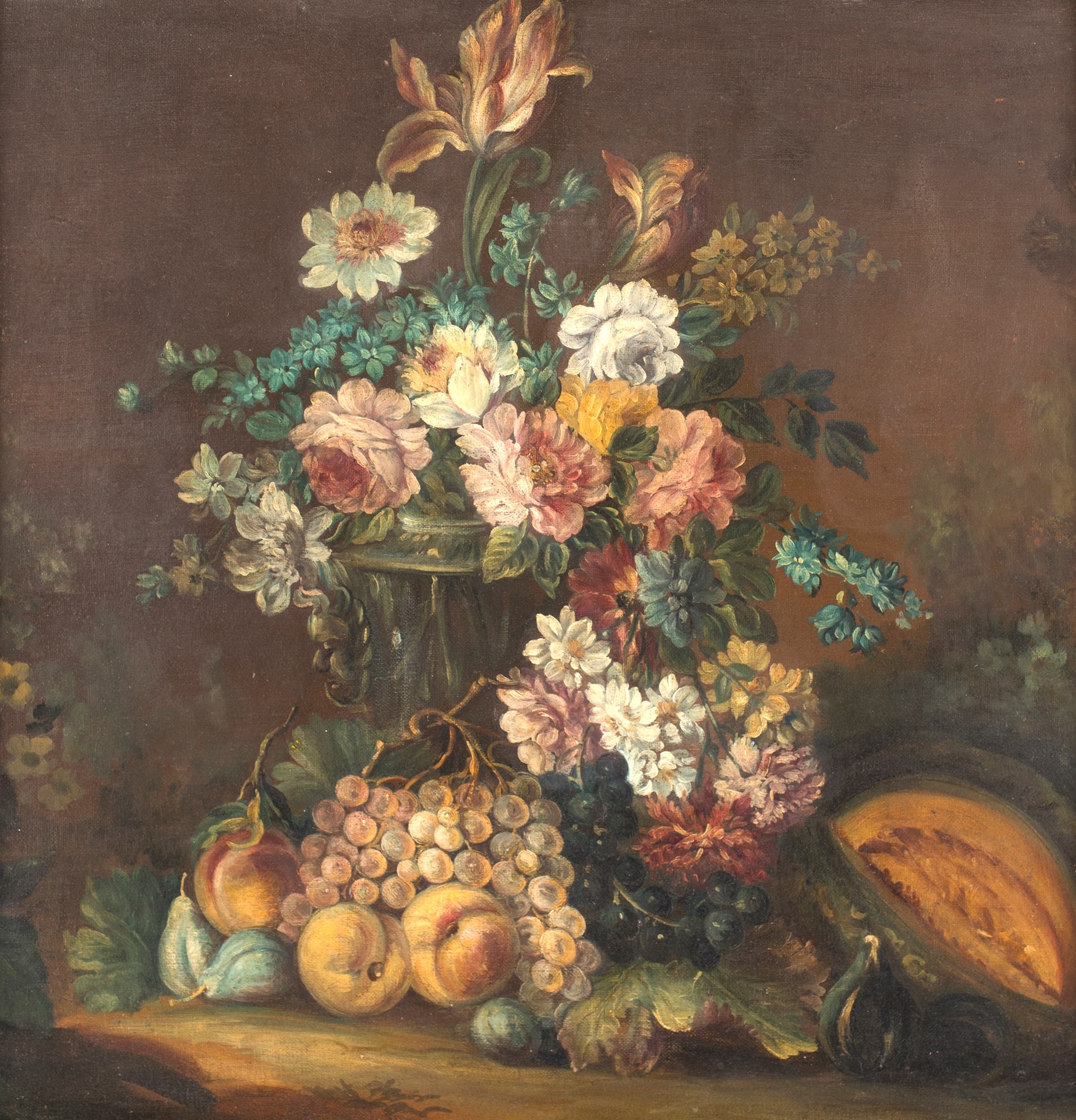 Pittore del XIX secolo , Natura morta di fiori e frutta F2, olio su tela, 70x70
