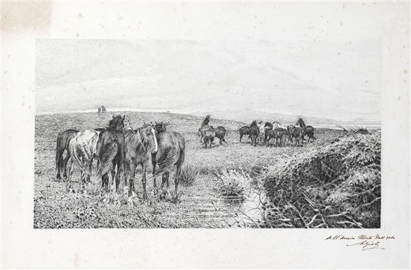 Luigi Gioli "Cavalli al pascolo" acquaforte (mm 240x450.5) Firmato e dedicato