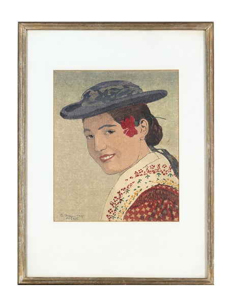 Carl Moser "Contadina tirolese" 1935 xilografia a colori su carta (cm 28,5x23,5)