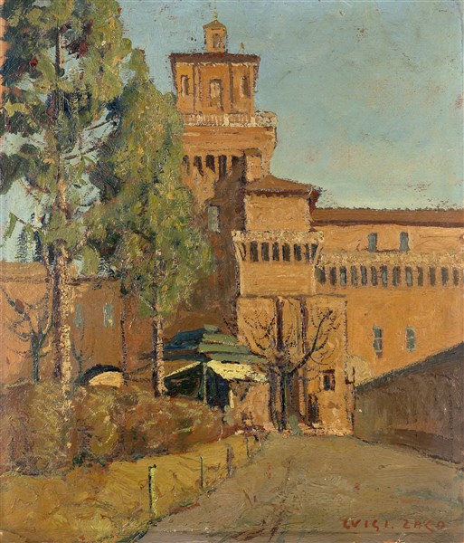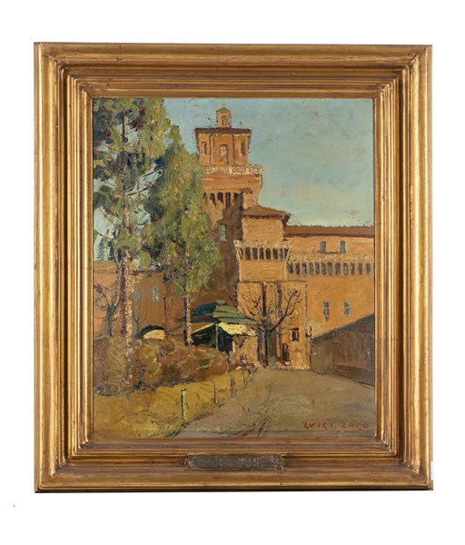 Luigi Zago "Castello Estense di Ferrara" olio su cartone (cm 41x33) Firmato in