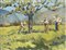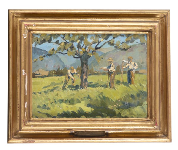 Luigi Zago "Falciatori in Val di Non" 1927 olio su cartone (cm 30x40) Firmato e
