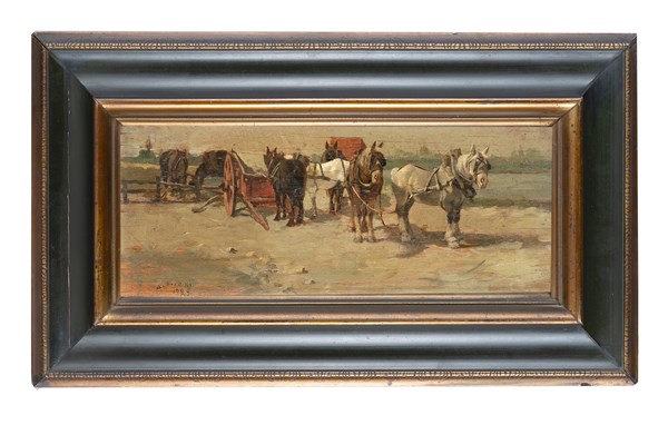Alfredo Soressi "Cavalli a riposo" 1929 olio su compensato (cm 14x35) Firmato e