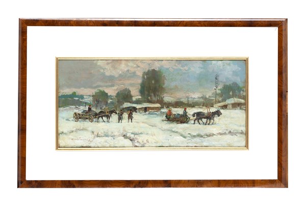Alessio Issupoff "Campagna russa in inverno" olio su tavola (cm 27,5x60) Firmat