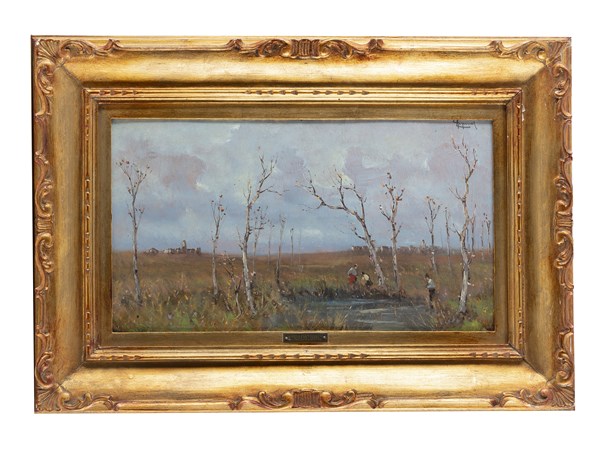 Lorenzo Gignous "Il laghetto" olio su cartone (cm 24x43) Firmato in alto a dest