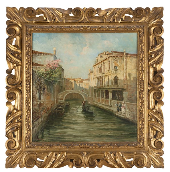 Lotto 382 | Alberto Rossi "L'arrivo della gondola" olio su tela (cm 55,5x54) Firmato in bas